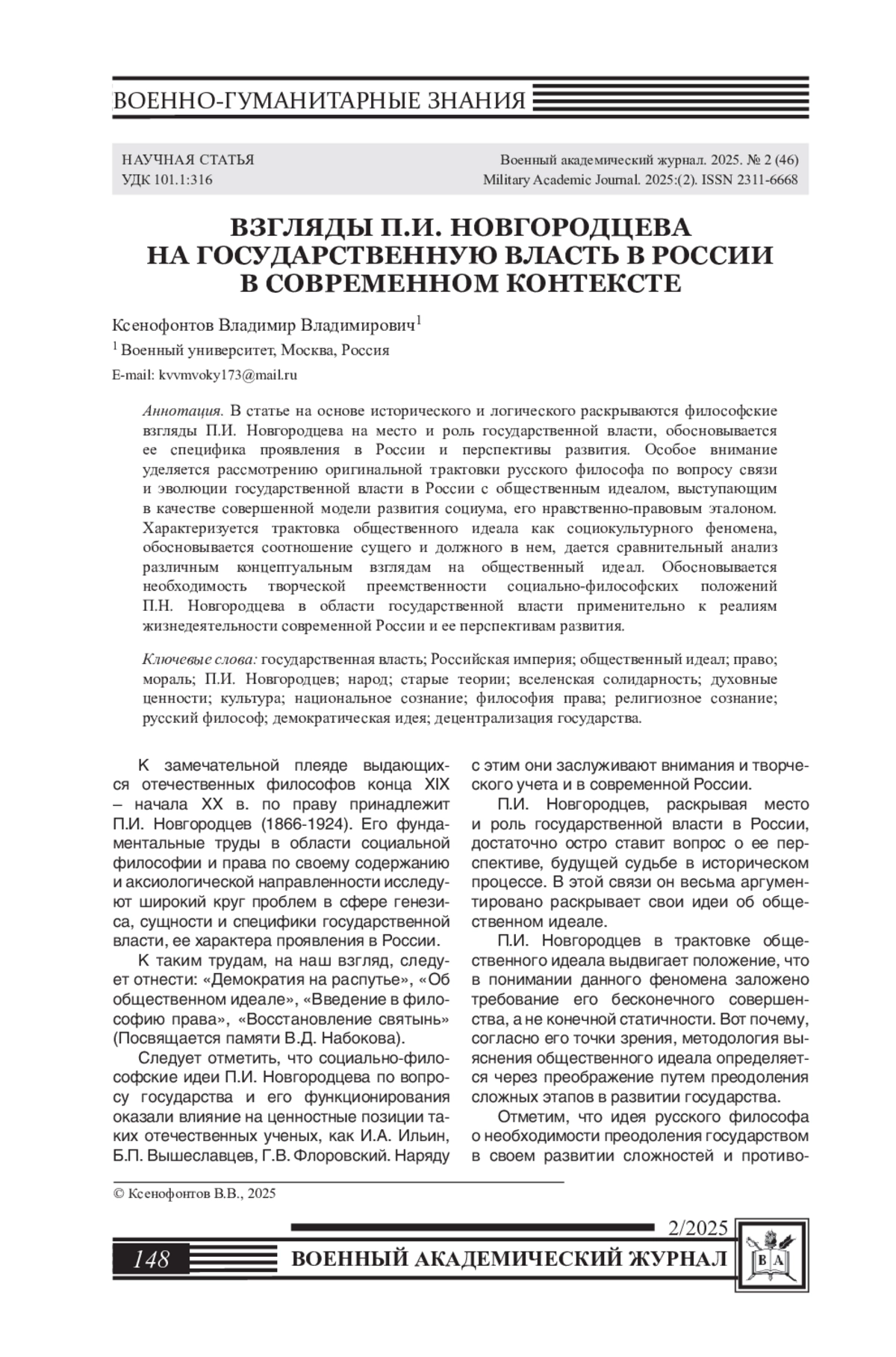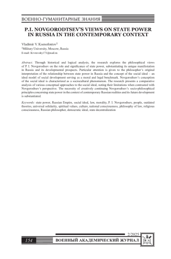 В статье на основе исторического и логического раскрываются философские взгляды П. И. Новгородцева на место и роль государственной власти, обосновывается ее специфика проявления в России и перспективы развития. Особое внимание уделяется рассмотрению оригинальной трактовки русского философа по вопросу связи и эволюции государственной власти в России с общественным идеалом, выступающим в качестве совершенной модели развития социума, его нравственно-правовым эталоном. Характеризуется трактовка общественного идеала как социокультурного феномена, обосновывается соотношение сущего и должного в нем, дается сравнительный анализ различным концептуальным взглядам на общественный идеал. Обосновывается необходимость творческой преемственности социально-философских положений П. Н. Новгородцева в области государственной власти применительно к реалиям жизнедеятельности современной России и ее перспективам развития.