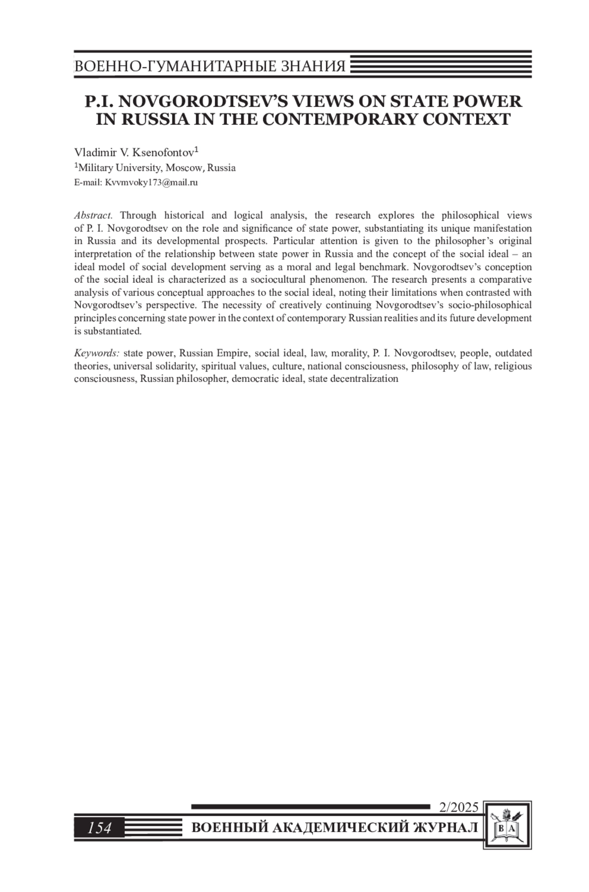К замечательной плеяде выдающихся отечественных философов конца XIX – начала ХХ в. по праву принадлежит П. И. Новгородцев (1866-1924). Его фундаментальные труды в области социальной философии и права по своему содержанию и аксиологической направленности исследуют широкий круг проблем в сфере генезиса, сущности и специфики государственной власти, ее характера проявления в России.