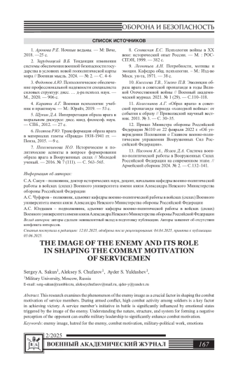 7. Поломошнова Н.О. Исторические и политические аспекты в вопросе формирования образа врага в Вооруженных силах // Молодой ученый. - 2016. № 7 (111). - С. 563-565. EDN: VTZDZV