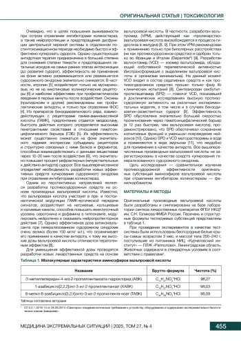 Выводы. Новые аминоэфиры вальпроевой кислоты проявляют противосудорожную активность при интоксикации обратимым ингибитором холинэстераз. В дозе 21,5 мг/кг м. т. наиболее эффективен ХАВК, однако в дозе 43 мг/кг м. т. наблюдаются проявления токсичности и более эффективен АВК. Несмотря на летальность животных, ТАВК также проявляет свою эффективность в дозе 43 мг/кг м. т.