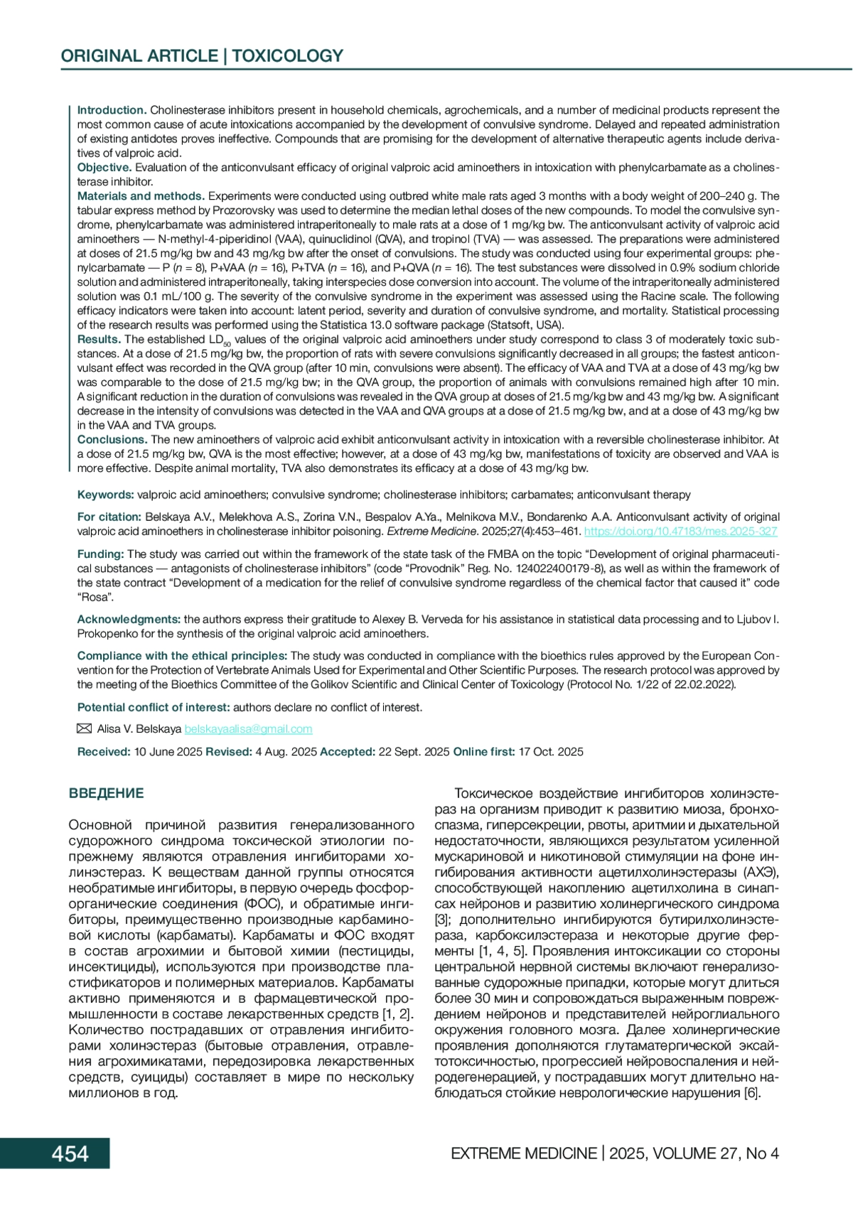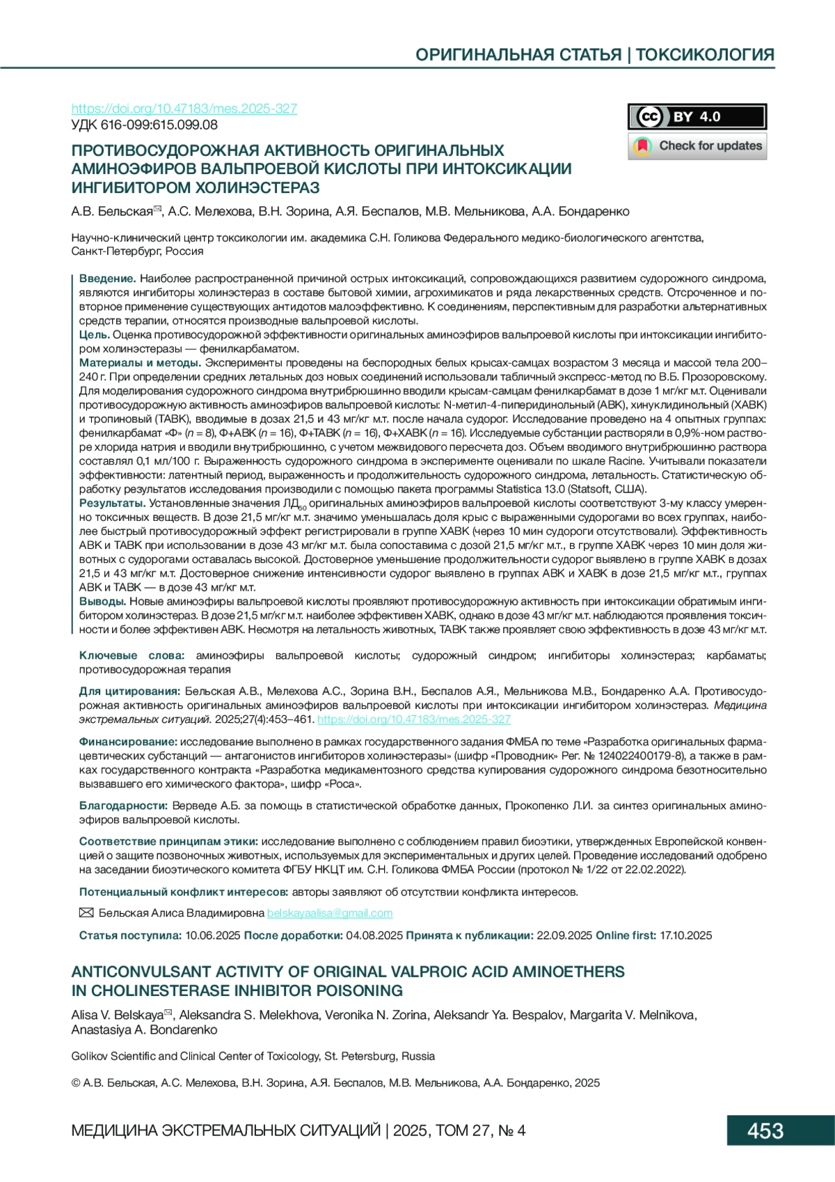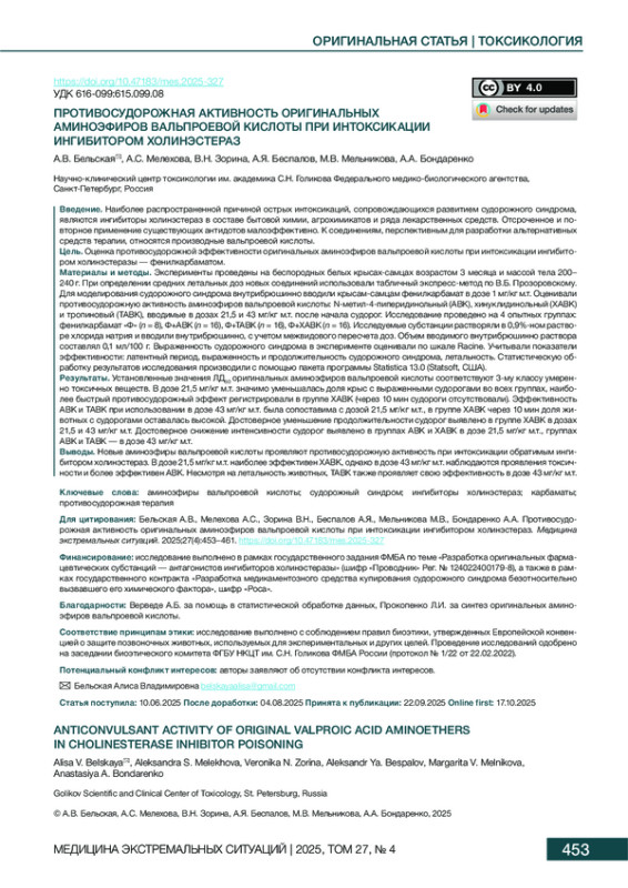 15. Мелехова АС, Бельская АВ, Зорина ВН, Мельникова МВ, Кубарская ЛГ, Гайкова ОН. Новая экспериментальная модель судорожного синдрома на основе фенилкарбамата.