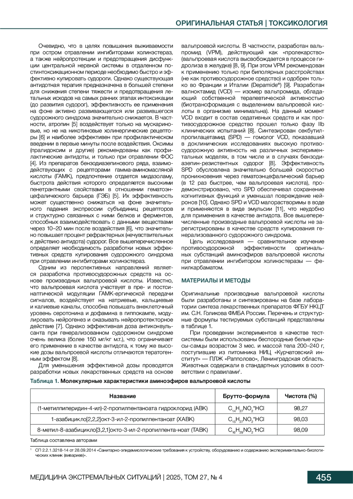 Цель. Оценка противосудорожной эффективности оригинальных аминоэфиров вальпроевой кислоты при интоксикации ингибитором холинэстеразы — фенилкарбаматом.