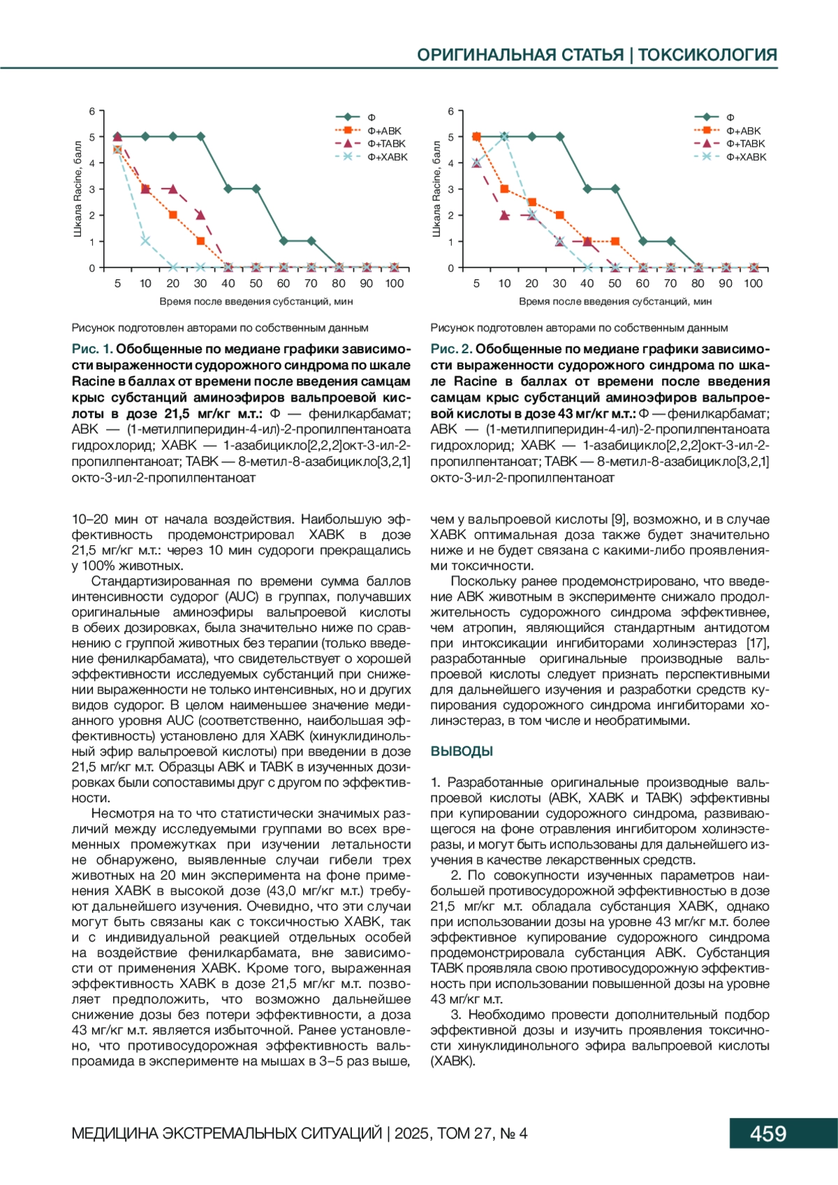 Материалы и методы. Эксперименты проведены на беспородных белых крысах-самцах возрастом 3 месяца и массой тела 200– 240 г. При определении средних летальных доз новых соединений использовали табличный экспресс-метод по В. Б. Прозоровскому. Для моделирования судорожного синдрома внутрибрюшинно вводили крысам-самцам фенилкарбамат в дозе 1 мг/кг м. т. Оценивали противосудорожную активность аминоэфиров вальпроевой кислоты: N-метил-4-пиперидинольный (АВК), хинуклидинольный (ХАВК) и тропиновый (ТАВК), вводимые в дозах 21,5 и 43 мг/кг м. т. после начала судорог. Исследование проведено на 4 опытных группах: фенилкарбамат «Ф» (n = 8), Ф+АВК (n = 16), Ф+ТАВК (n = 16), Ф+ХАВК (n = 16). Исследуемые субстанции растворяли в 0,9%-ном растворе хлорида натрия и вводили внутрибрюшинно, с учетом межвидового пересчета доз. Объем вводимого внутрибрюшинно раствора составлял 0,1 мл/100 г. Выраженность судорожного синдрома в эксперименте оценивали по шкале Racine. Учитывали показатели эффективности: латентный период, выраженность и продолжительность судорожного синдрома, летальность. Статистическую обработку результатов исследования производили с помощью пакета программы Statistica 13.0 (Statsoft, США).