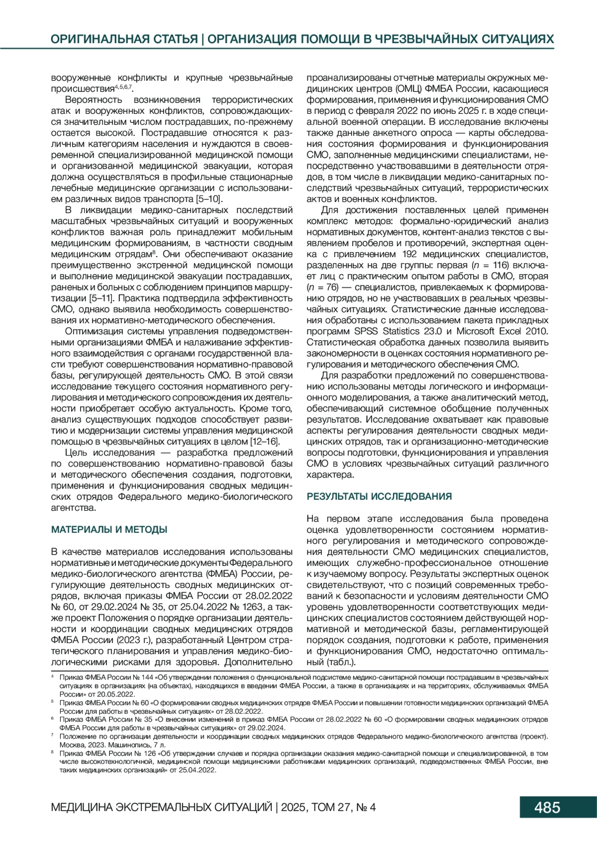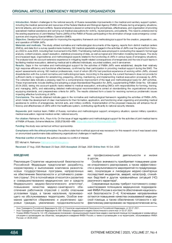 Материалы и методы. В исследовании использованы нормативные и методические документы Агентства, отчетные материалы окружных медицинских центров (ОМЦ) и данные анкетного опроса 192 медицинских специалистов, вовлеченных в деятельность сводных медицинских отрядов в период 02.2022–06.2025, включая опыт участия в специальной военной операции. При выполнении исследования применялись следующие методы: формально-юридический и контент-анализ, экспертная оценка, статистическая обработка данных, а также методы логического и информационного моделирования. Исследование охватывало правовые, организационные и методические аспекты функционирования СМО в условиях чрезвычайных ситуаций различного характера. Анализ проводился с учетом обширного опыта ликвидации медико-санитарных последствий ЧС и участия СМО в осуществлении медицинской эвакуации, оказании медицинской помощи пострадавшим, раненым и больным военнослужащим.