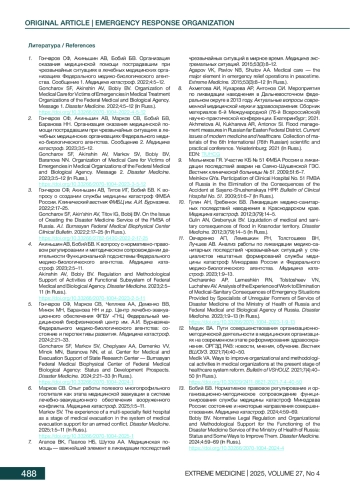 2. Гончаров СФ, Акиньшин АВ, Марков СВ, Бобий БВ, Баранова НН. Организация оказания медицинской помощи пострадавшим при чрезвычайных ситуациях в лечебных медицинских организациях Федерального медико-биологического агентства. Сообщение 2. Медицина катастроф. 2023;3:5-12. DOI: 10.33266/2070-1004-2023-3-5-12