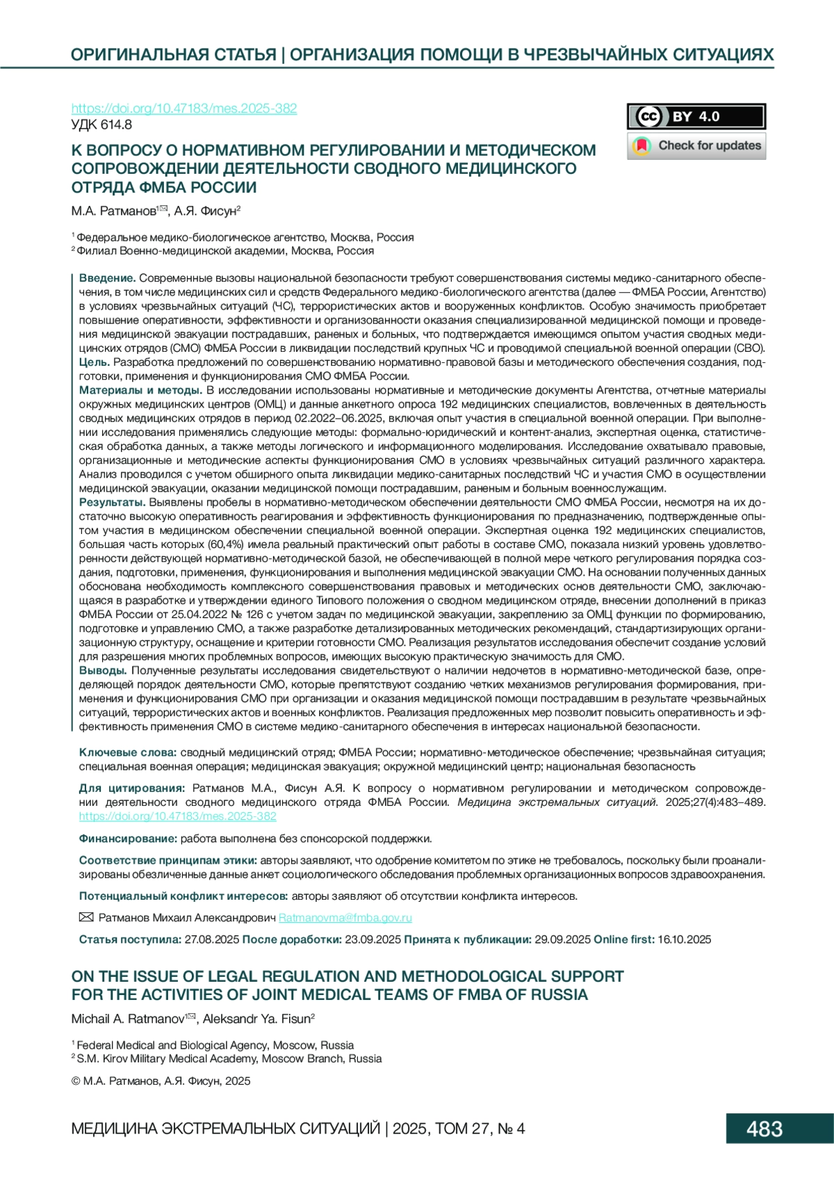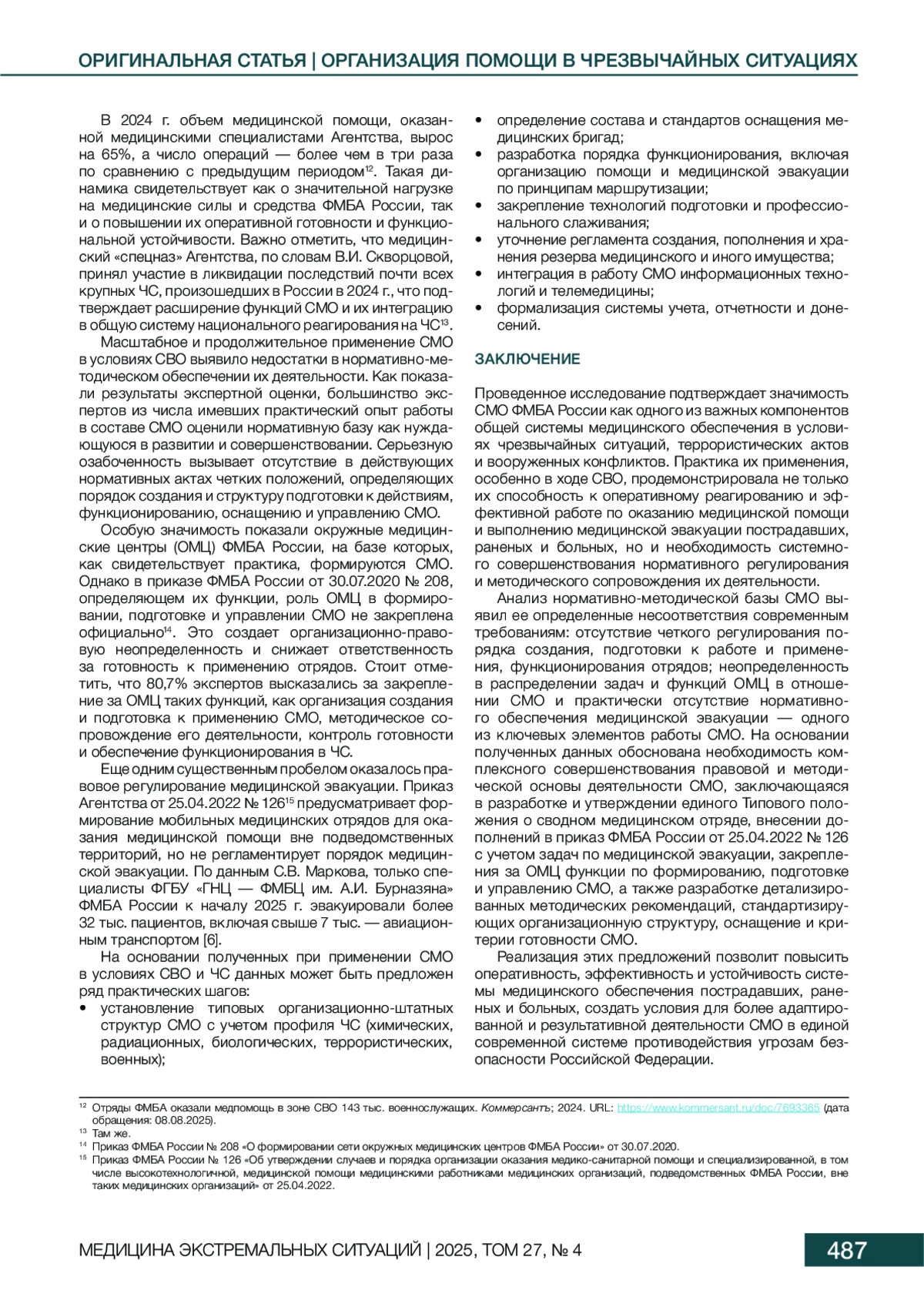 Результаты. Выявлены пробелы в нормативно-методическом обеспечении деятельности СМО ФМБА России, несмотря на их достаточно высокую оперативность реагирования и эффективность функционирования по предназначению, подтвержденные опытом участия в медицинском обеспечении специальной военной операции. Экспертная оценка 192 медицинских специалистов, большая часть которых (60,4%) имела реальный практический опыт работы в составе СМО, показала низкий уровень удовлетворенности действующей нормативно-методической базой, не обеспечивающей в полной мере четкого регулирования порядка создания, подготовки, применения, функционирования и выполнения медицинской эвакуации СМО. На основании полученных данных обоснована необходимость комплексного совершенствования правовых и методических основ деятельности СМО, заключающаяся в разработке и утверждении единого Типового положения о сводном медицинском отряде, внесении дополнений в приказ ФМБА России от 25.04.2022 № 126 с учетом задач по медицинской эвакуации, закреплению за ОМЦ функции по формированию, подготовке и управлению СМО, а также разработке детализированных методических рекомендаций, стандартизирующих организационную структуру, оснащение и критерии готовности СМО. Реализация результатов исследования обеспечит создание условий для разрешения многих проблемных вопросов, имеющих высокую практическую значимость для СМО.
