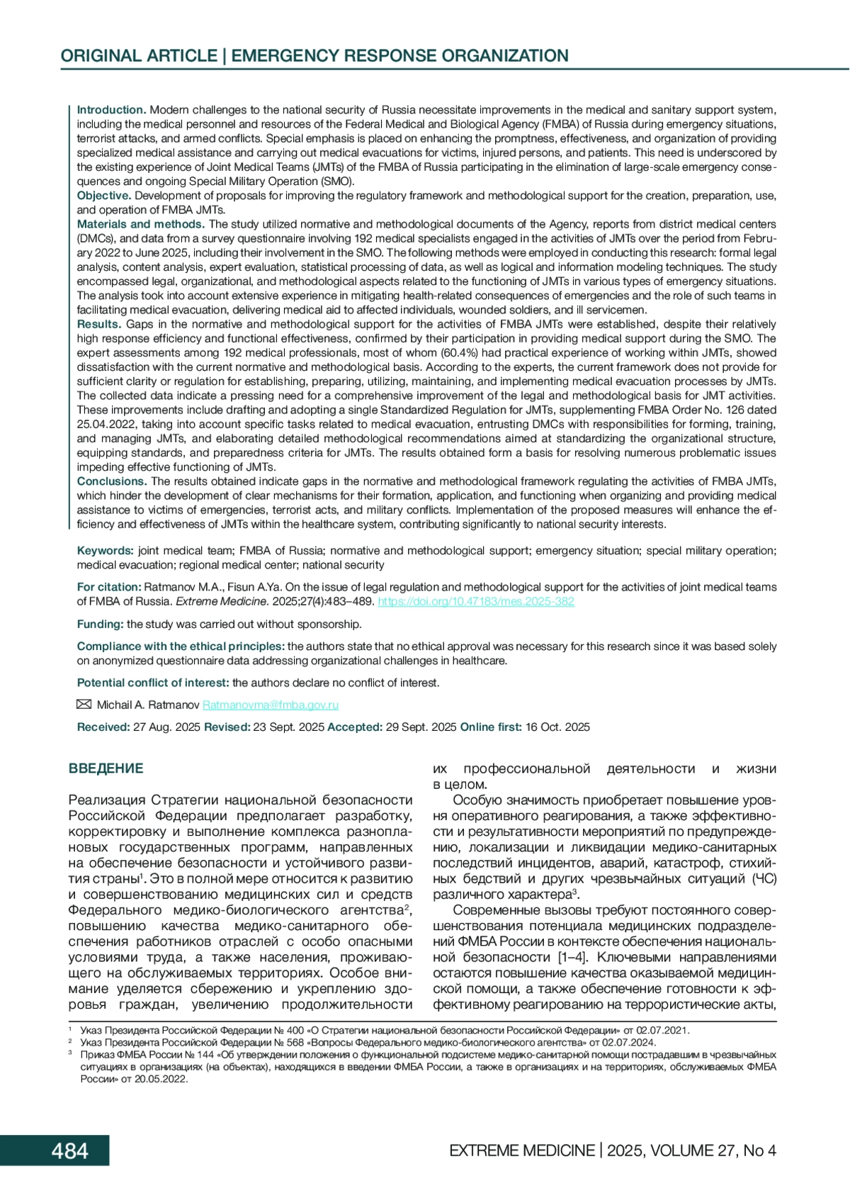 4. Акиньшин АВ, Бобий БВ. К вопросу о нормативно-правовом регулировании и методическом сопровождении деятельности Функциональной подсистемы Федерального медико-биологического агентства. Медицина катастроф. 2023;2:5-11. DOI: 10.33266/2070-1004-2023-2-5-11