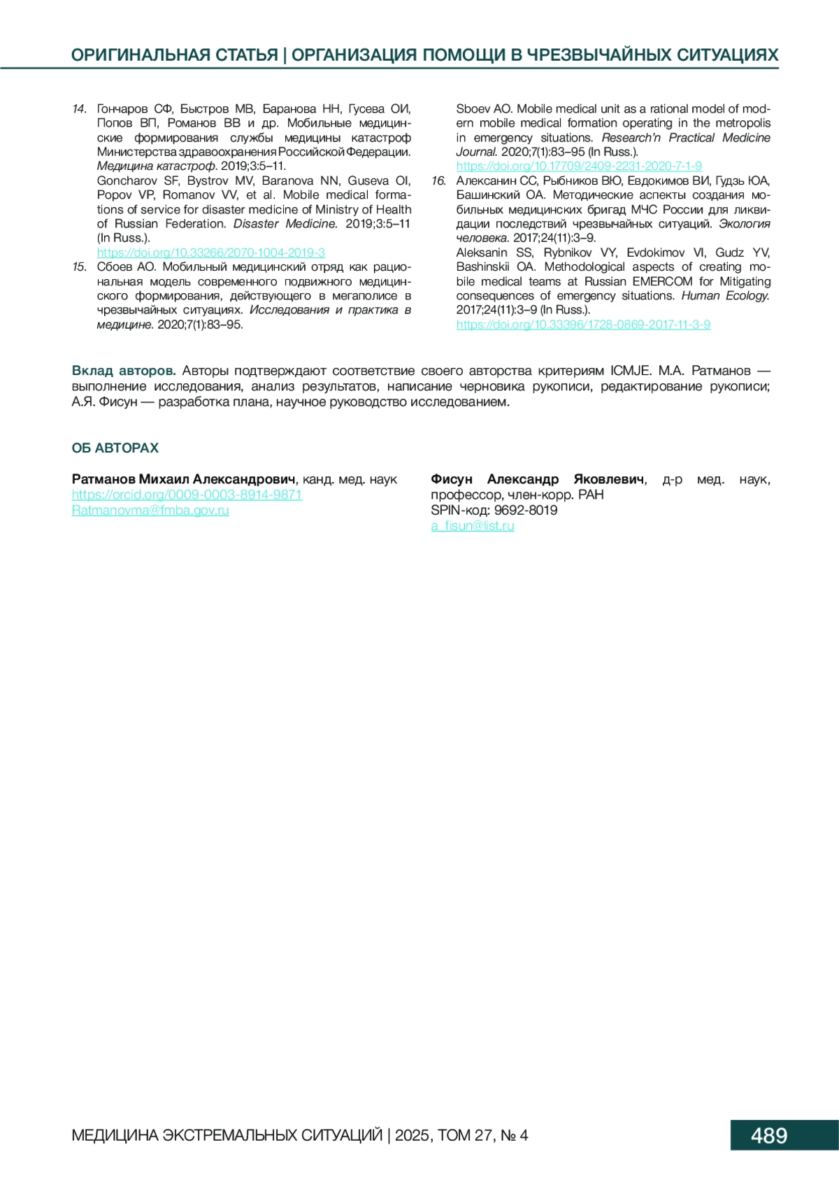 14. Гончаров СФ, Быстров МВ, Баранова НН, Гусева ОИ, Попов ВП, Романов ВВ и др. Мобильные медицинские формирования службы медицины катастроф Министерства здравоохранения Российской Федерации. Медицина катастроф. 2019;3:5-11. DOI: 10.33266/2070-1004-2019-3