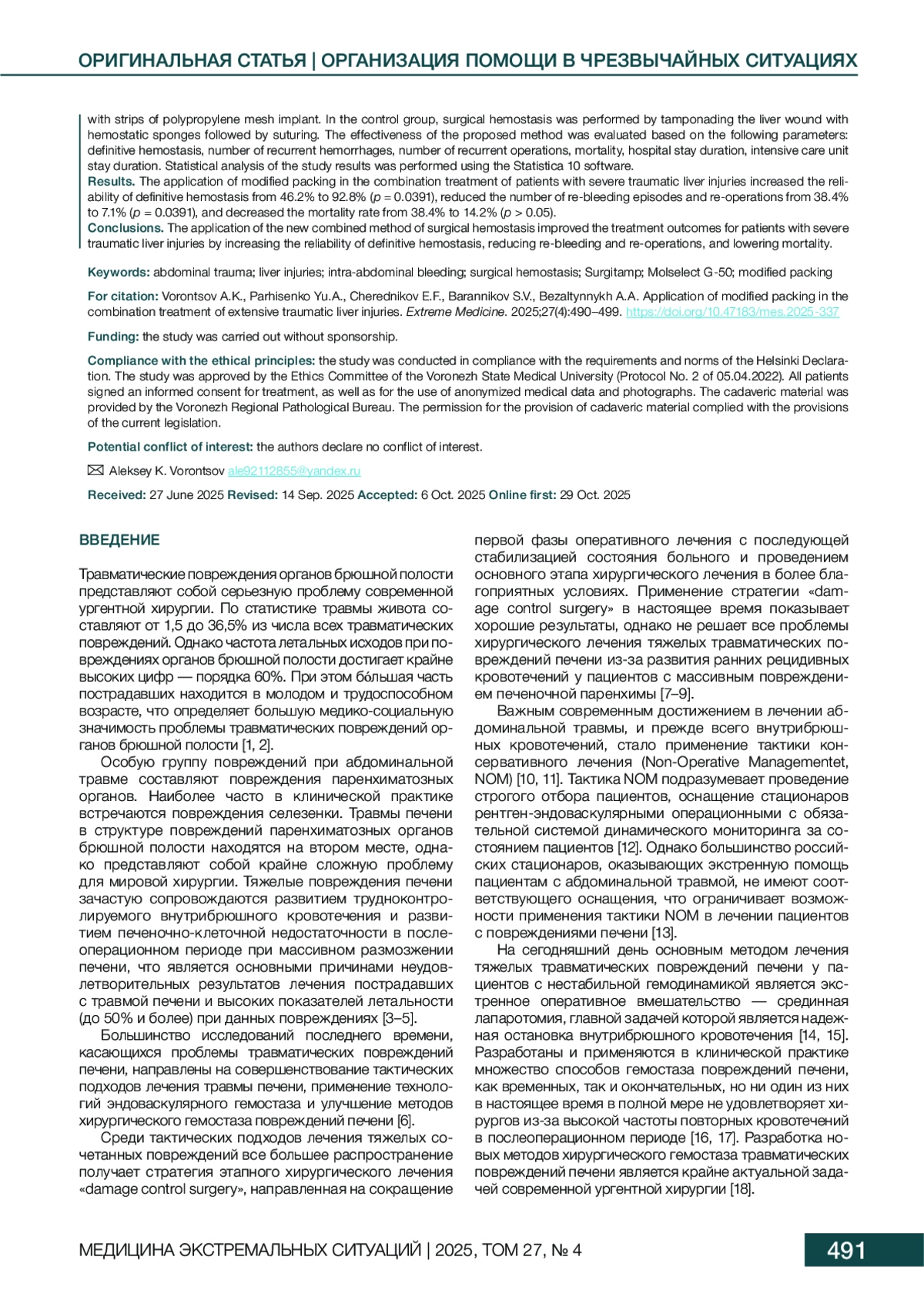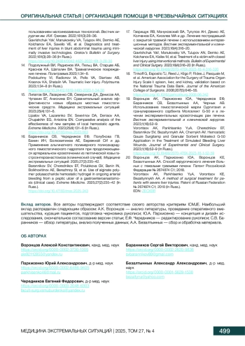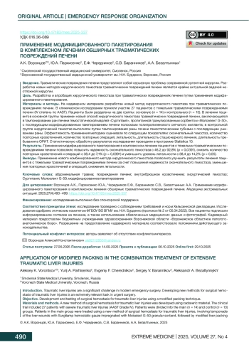 3. Воронцов АК, Пархисенко ЮА, Чередников ЕФ, Баранников СВ, Черных АВ, Безалтынных АА и др. Экспериментальное обоснование применения нового метода хирургического гемостаза обширных травматических повреждений печени. Волгоградский научно-медицинский журнал. 2023;20(2):45-50.