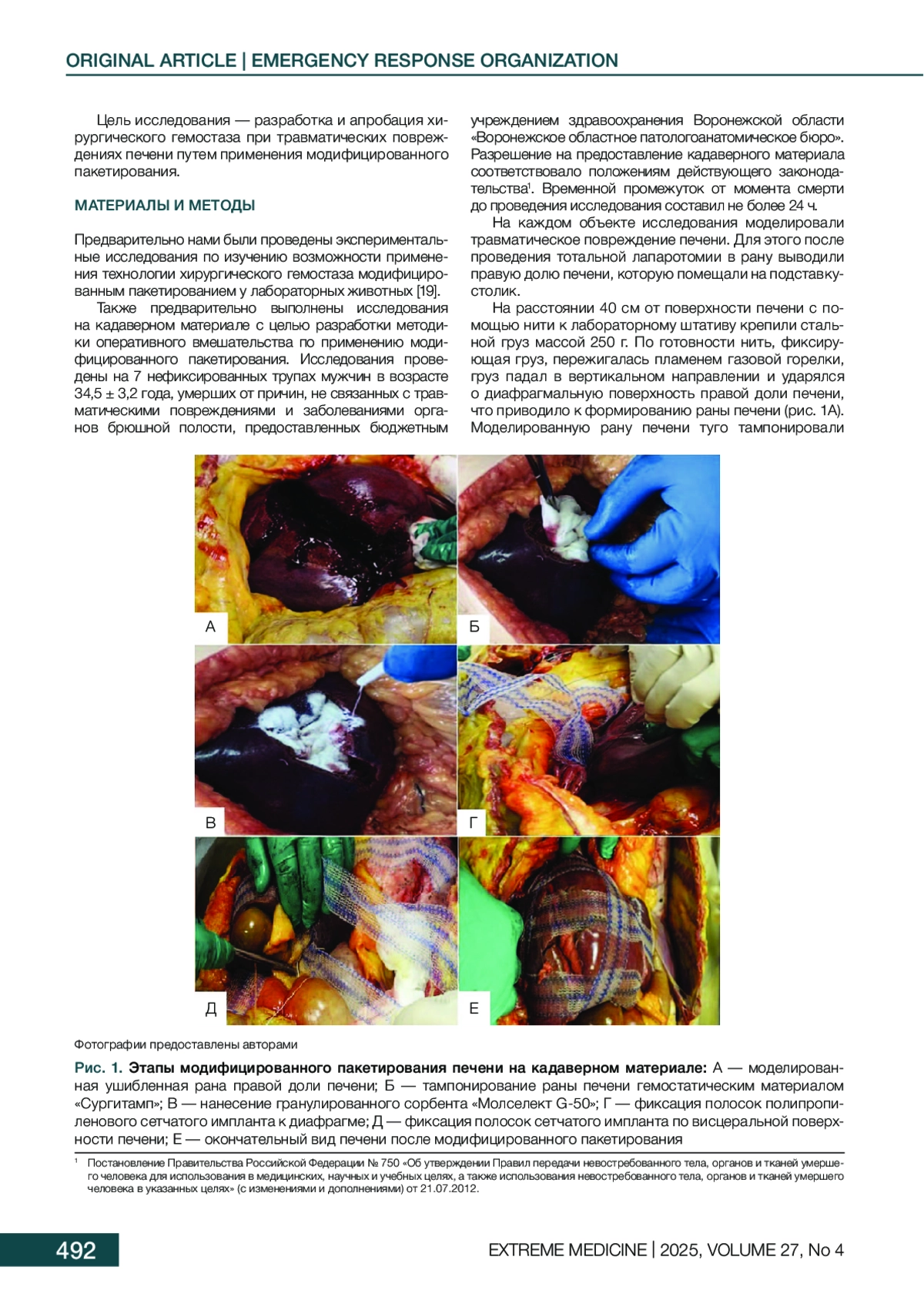 Введение. Травматические повреждения печени представляют собой серьезную проблему современной ургентной хирургии. Разработка новых методов хирургического гемостаза травматических повреждений печени является крайне актуальной задачей неотложной хирургии.