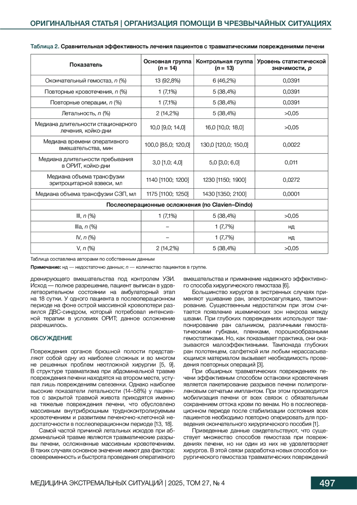 Материалы и методы. На кадаверном материале разработан новый метод хирургического гемостаза при травматических повреждениях печени. В клиническом исследовании приняли участие 27 пациентов с тяжелыми травматическими повреждениями печени (IV степень по AAST). Пациенты были разделены на две группы: основную (n = 14) и контрольную (n = 13). В лечении пациентов основной группы применен новый способ хирургического гемостаза травматических повреждений печени, заключающийся в тампонировании ран печени гемостатической марлей «Сургитамп», пропитанной гранулированным сорбентом «Молселект G-50», с последующим модифицированным пакетированием печени полосками полипропиленового сетчатого импланта; в контрольной группе хирургический гемостаз выполняли путем тампонирования раны печени гемостатическими губками с последующим ушиванием раны. Эффективность применения методики оценивали по следующим показателям: окончательный гемостаз, количество повторных кровотечений, количество повторных операций, летальность, длительность стационарного лечения, длительность пребывания в ОРИТ. Статистическую обработку результатов исследования проводили в программе Statistica 10.