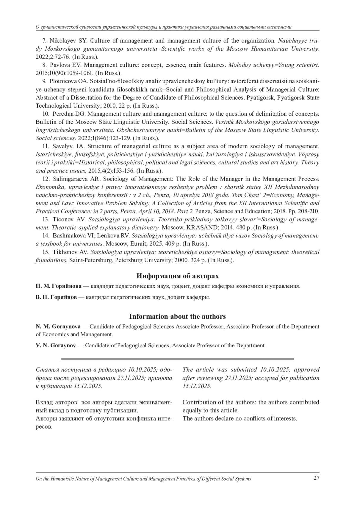 10. Передня Д. Г. Управленческая культура и культура управления: к вопросу о разграничении понятий// Вестник Московского государственного лингвистического университета. Общественные науки. 2022. № 1 (846). С. 123-129. EDN: GIBJNJ