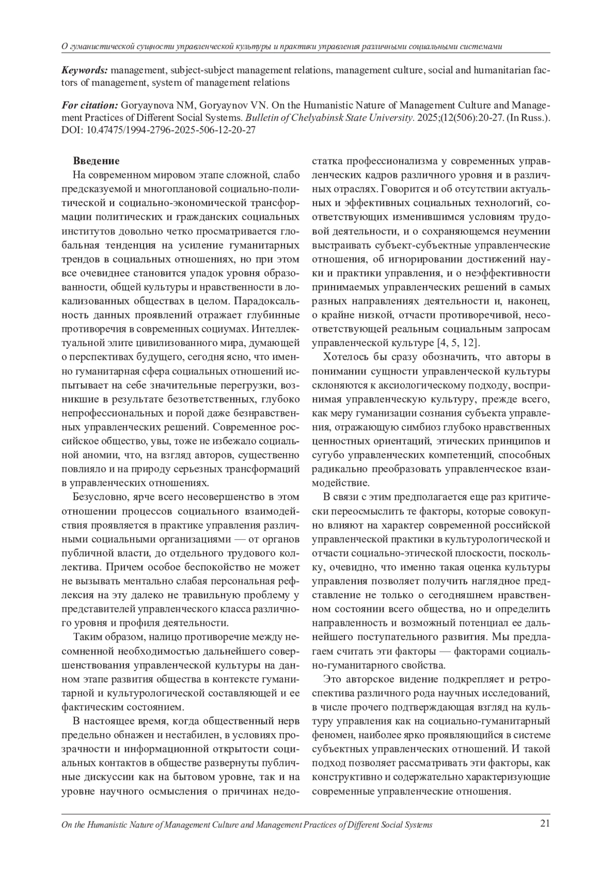 В данной статье проведен краткий анализ составляющих управленческой культуры с учетом социально-гуманитарной и культурологической сущности данного феномена, сформулировано противоречие между требованиями к траектории дальнейшего развития управленческой культуры в современной гуманистической парадигме и ее реального воплощения в практике управления различными социальными системами. По мнению авторов, гуманистическая сущность феномена управленческой культуры, определяемая специфической иерархией руководства и подчинения, генетически формируется как единая система качеств и характеристик в естественном процессе исторического и социокультурного развития практики управленческой деятельности под определяющим влиянием системы традиционных для локализованных обществ нравственных норм и ценностей, придающих этому феномену собственно гуманистический контекст. Авторами предложено также рассматривать управленческую культуру как качественный показатель деятельности в системе социальных взаимоотношений, определяемых специфической иерархией руководства и подчинения, как один из основных показателей профессионализма и нравственности представителей управленческого класса, а также оценки эффективности практики управленческой деятельности.