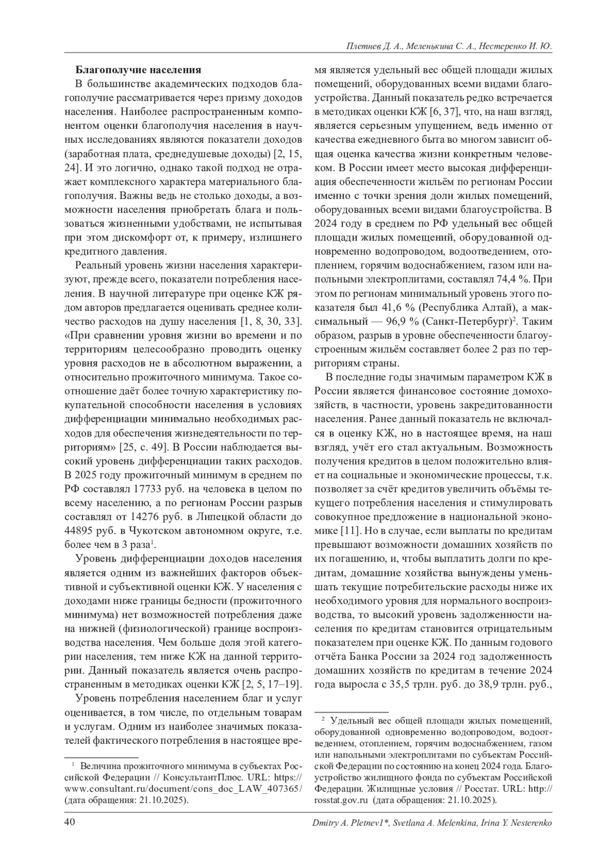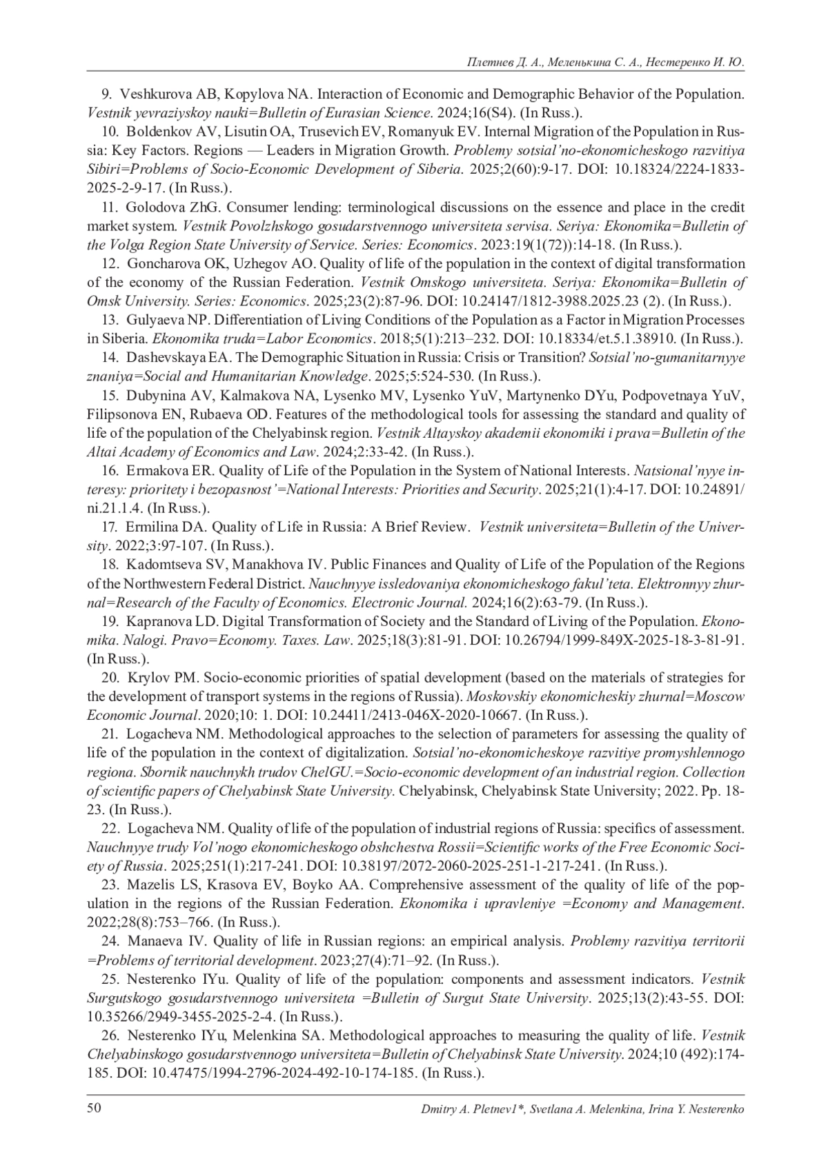 25. Нестеренко И. Ю. Качество жизни населения: компоненты и показатели оценки // Вестник Сургутского государственного университета. 2025. Т. 13, № 2. С. 43-55. DOI: 10.35266/2949-3455-2025-2-4 EDN: HEDGYU