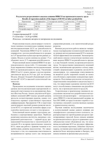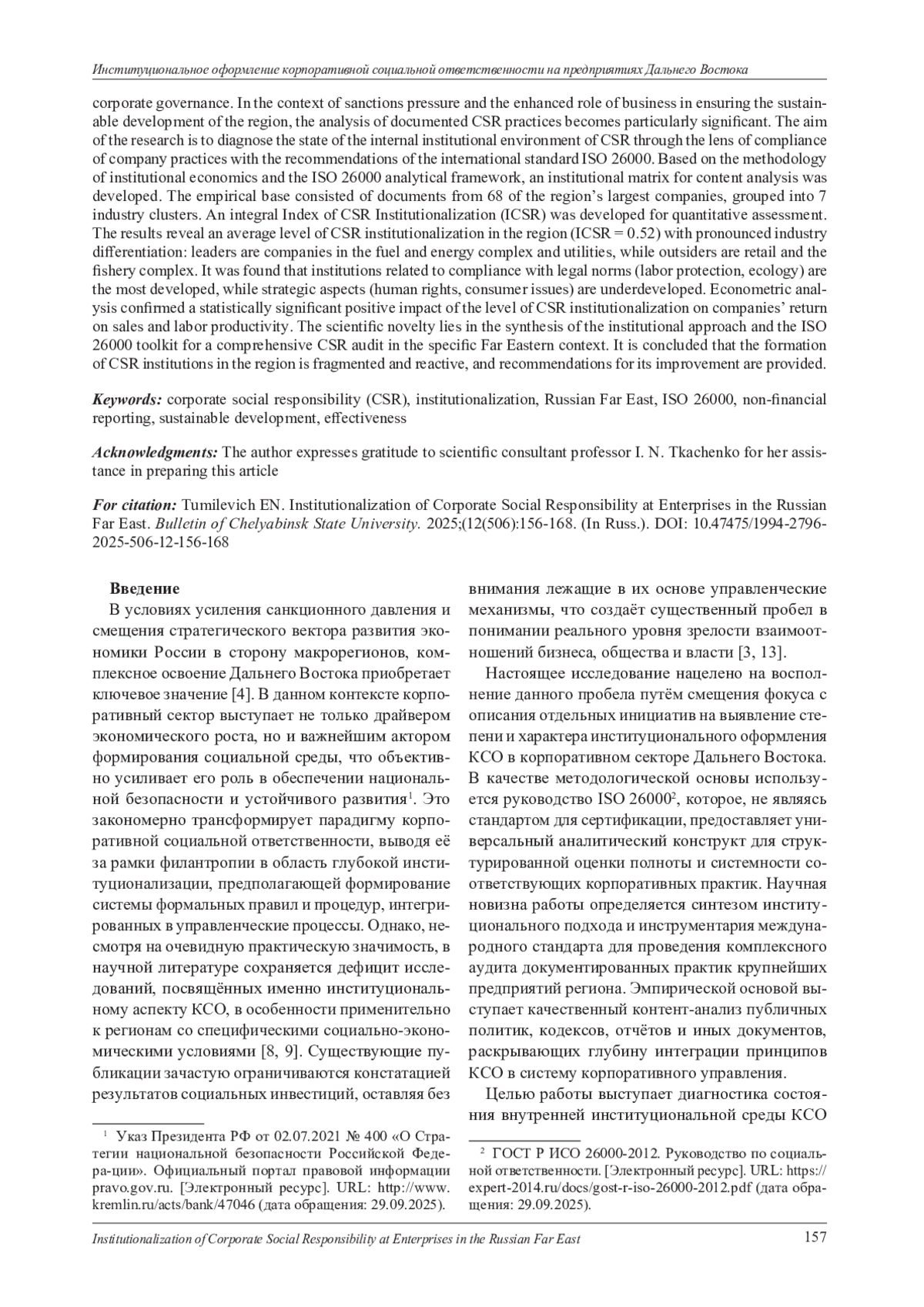 Статья посвящена исследованию процесса институционального оформления корпоративной социальной ответственности (КСО) на предприятиях Дальневосточного федерального округа России. Актуальность работы обусловлена стратегической важностью Дальнего Востока для экономики страны и необходимостью перехода от филантропической модели КСО к ее системной интеграции в корпоративное управление. В условиях санкционного давления и усиления роли бизнеса в обеспечении устойчивого развития региона анализ документированных практик КСО приобретает особую значимость. Целью исследования является диагностика состояния внутренней институциональной среды КСО через призму соответствия документированных практик компаний рекомендациям международного стандарта ISO 26000. На основе методологии институциональной экономики и аналитического фреймворка ISO 26000 разработана институциональная матрица для контент-анализа. Эмпирическую базу составили документы 68 крупнейших компаний региона, сгруппированных в 7 отраслевых кластеров. Для количественной оценки разработан интегральный индекс институционализации КСО (ИИКСО). В результате выявлен средний уровень институционализации КСО в регионе (ИИКСО = 0,52) с выраженной отраслевой дифференциацией: лидерами являются компании ТЭК и энергетики, а аутсайдерами ритейл и рыбохозяйственный комплекс. Установлено, что наиболее развиты институты, связанные с исполнением законодательных норм (охрана труда, экология), в то время как стратегические аспекты (права человека, работа с потребителями) развиты слабо. Эконометрический анализ подтвердил статистически значимое положительное влияние уровня институционализации КСО на рентабельность продаж и производительность труда компаний. Научная новизна заключается в синтезе институционального подхода и инструментария ISO 26000 для проведения комплексного аудита КСО в специфическом дальневосточном контексте. Сделан вывод о фрагментарном и реактивном характере формирования институтов КСО в регионе и даны рекомендации по его совершенствованию.