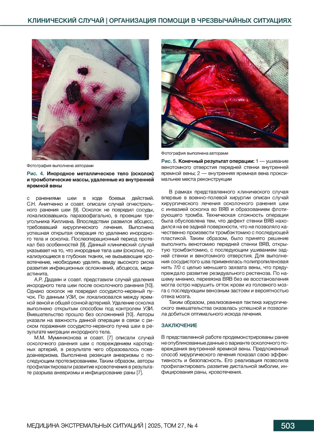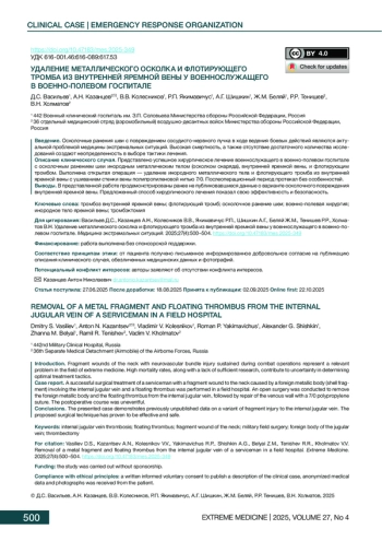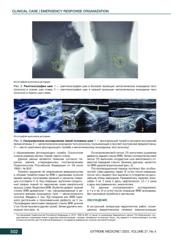 Выводы. В представленной работе продемонстрированы ранее не публиковавшиеся данные о варианте осколочного повреждения внутренней яремной вены. Предложенный способ хирургического лечения показал свою эффективность и безопасность.