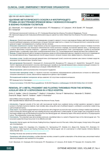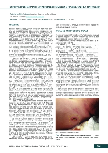 Военно-полевая сосудистая хирургия является актуальным направлением современной медицины экстремальных состояний. Однако в существующей литературе недостаточно исследований, посвященных хирургическому лечению пациентов с травмой сосудов в ходе боевых действий. Такая тенденция объясняется отчетом В. А. Оппеля от 1915 г. [1], выполненным в период Первой мировой войны. В то время в военных госпиталях пациентов с повреждениями магистральных артерий и вен выявлялось немного ввиду их гибели на поле боя от продолжающегося кровотечения [1]. В конечном счете количество военнослужащих с такими ранениями достигало лишь 1% и проявлялось в 30% случаев развитием ложной аневризмы, в 70% — кровотечением [2].