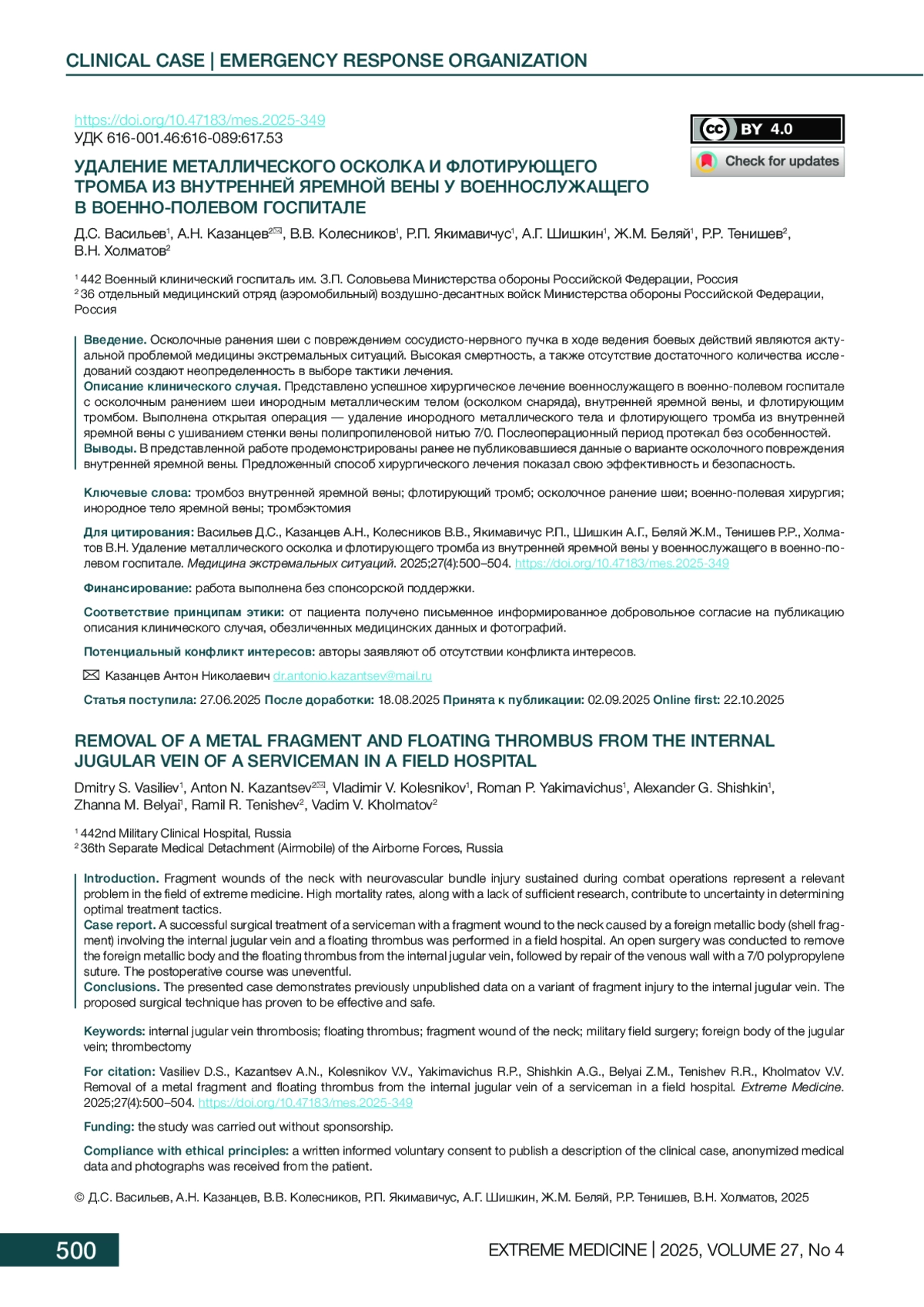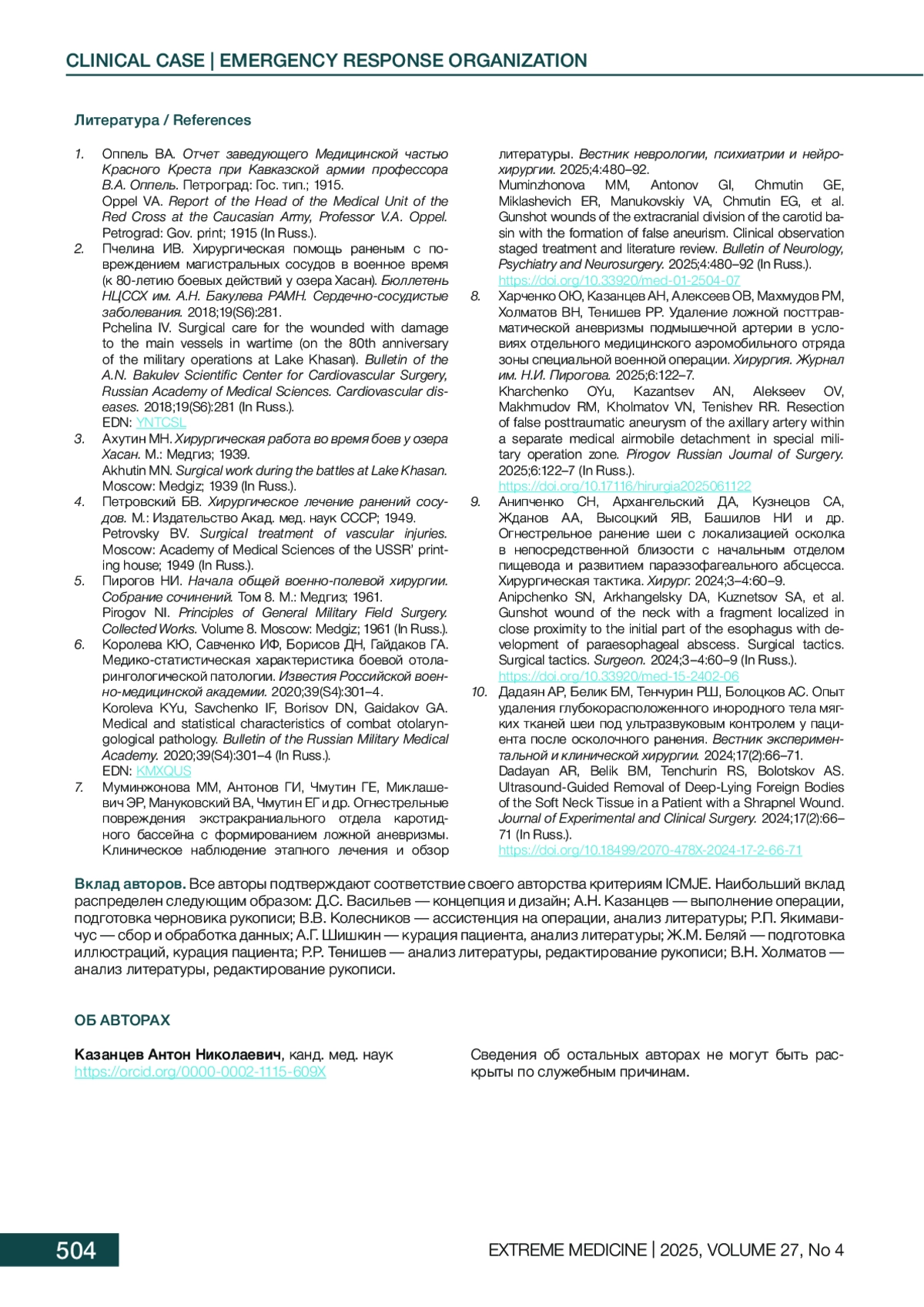 8. Харченко ОЮ, Казанцев АН, Алексеев ОВ, Махмудов РМ, Холматов ВН, Тенишев РР. Удаление ложной посттравматической аневризмы подмышечной артерии в условиях отдельного медицинского аэромобильного отряда зоны специальной военной операции. Хирургия. Журнал им. Н.И. Пирогова. 2025;6:122-7. DOI: 10.17116/hirurgia2025061122