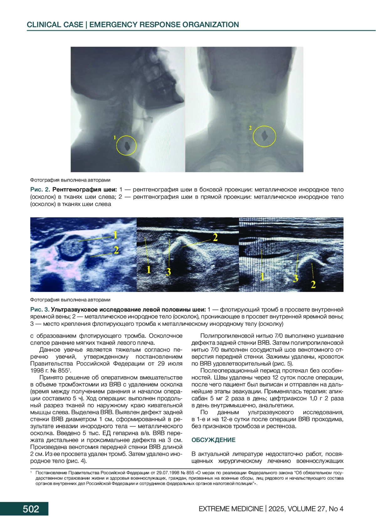 Описание клинического случая. Представлено успешное хирургическое лечение военнослужащего в военно-полевом госпитале с осколочным ранением шеи инородным металлическим телом (осколком снаряда), внутренней яремной вены, и флотирующим тромбом. Выполнена открытая операция — удаление инородного металлического тела и флотирующего тромба из внутренней яремной вены с ушиванием стенки вены полипропиленовой нитью 7/0. Послеоперационный период протекал без особенностей.