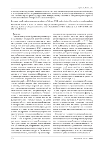 Статья посвящена комплексному исследованию влияния результативного управления цепочками поставок на эффективность производственного процесса в промышленности. Актуальность работы обусловлена усилением конкуренции и необходимостью адаптации предприятий к изменчивой внешней среде. Авторы выявляют и обосновывают взаимосвязь между управлением логистическими процессами и производственной эффективностью, используя модель SCOR и модель Синка и Татла. Методология исследования включает сбор и обработку панельных данных за период 2019-2024 годов по предприятиям Сирии, с применением регрессионного анализа. Полученные результаты подтвердили наличие статистически значимой положительной зависимости между надёжностью поставок, временем выполнения заказа и общей эффективностью производства. Новизна исследования заключается в разработке и апробации комплексной аналитической модели, оценивающей совокупное влияние логистических показателей на производственные результаты. В отличие от предшествующих работ, которые рассматривали отдельные аспекты управления поставками, предложенный подход позволяет системно учитывать ключевые элементы SCM и их интегральное воздействие на эффективность предприятия. Практическая значимость состоит в предоставлении инструментария для оценки и совершенствования стратегий управления цепочками поставок, что способствует укреплению конкурентных позиций и устойчивому развитию промышленных предприятий.