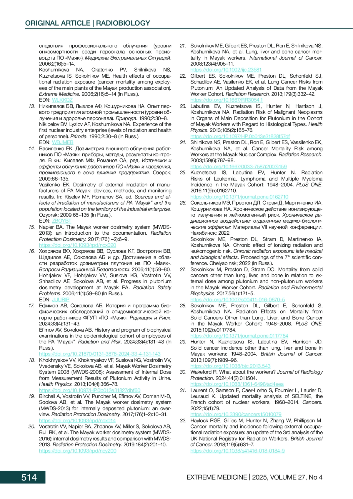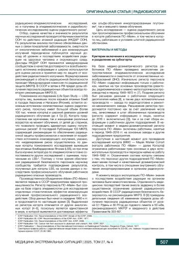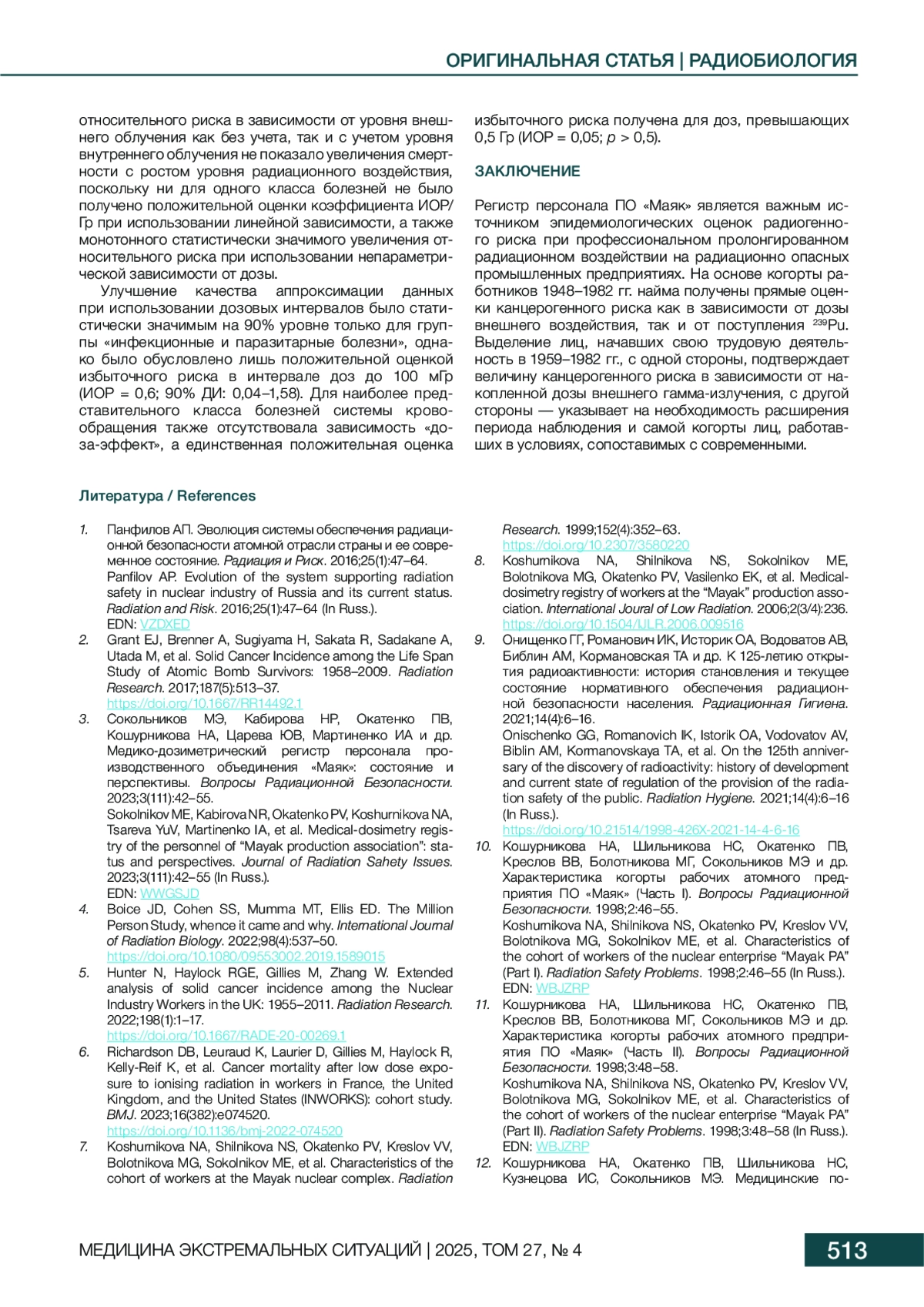 17. Ефимов АВ, Соколова АБ. История и программа биофизических обследований в эпидемиологической когорте работников ФГУП “ПО “Маяк”. Радиация и Риск. 2024;33(4):131-43. DOI: 10.21870/0131-3878-2024-33-4-131-143