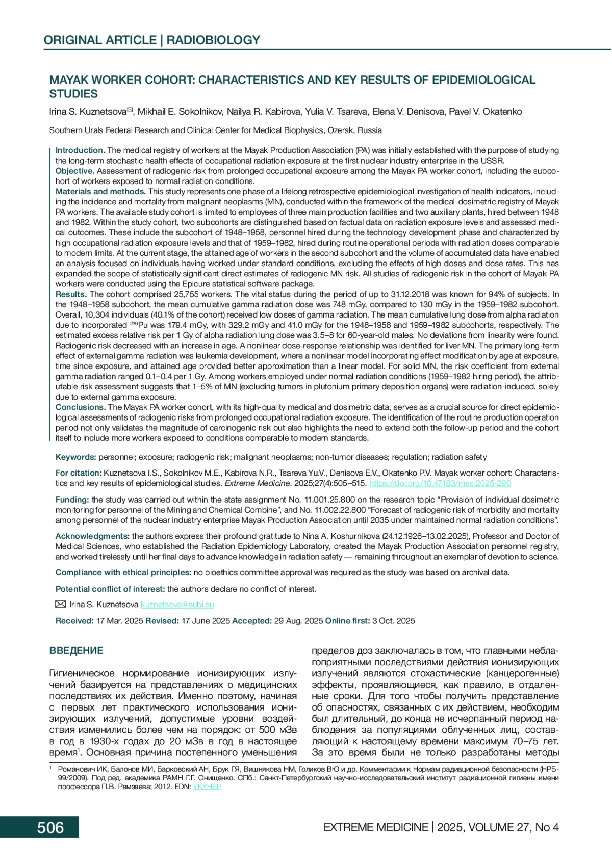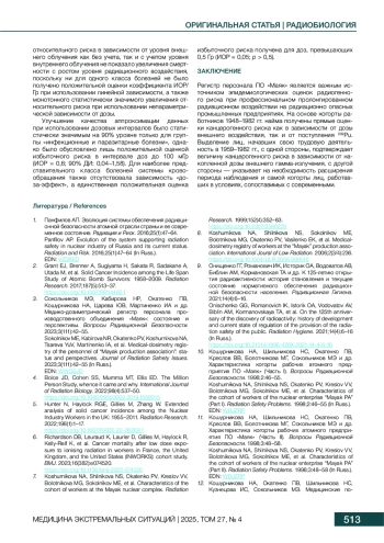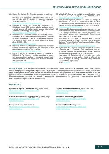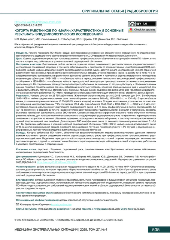 3. Сокольников МЭ, Кабирова НР, Окатенко ПВ, Кошурникова НА, Царева ЮВ, Мартиненко ИА и др. Медико-дозиметрический регистр персонала производственного объединения “Маяк”: состояние и перспективы. Вопросы Радиационной Безопасности. 2023;3(111):42-55.