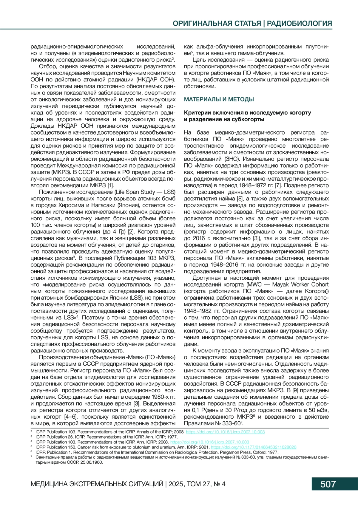 7. Koshurnikova NA, Shilnikova NS, Okatenko PV, Kreslov VV, Bolotnikova MG, Sokolnikov ME, et al. Characteristics of the cohort of workers at the Mayak nuclear complex. Radiation Research. 1999;152(4):352-63. DOI: 10.2307/3580220