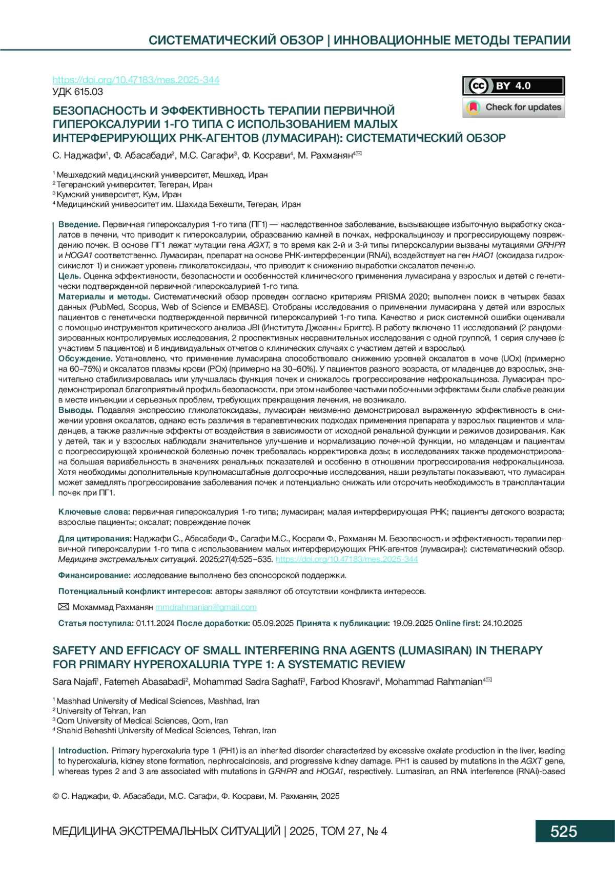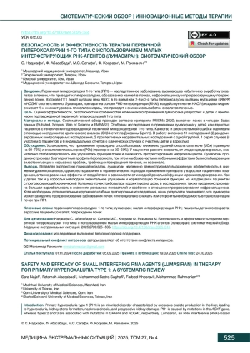 Обсуждение. Установлено, что применение лумасирана способствовало снижению уровней оксалатов в моче (UOx) (примерно на 60–75%) и оксалатов плазмы крови (POx) (примерно на 30–60%). У пациентов разного возраста, от младенцев до взрослых, значительно стабилизировалась или улучшалась функция почек и снижалось прогрессирование нефрокальциноза. Лумасиран продемонстрировал благоприятный профиль безопасности, при этом наиболее частыми побочными эффектами были слабые реакции в месте инъекции и серьезных проблем, требующих прекращения лечения, не возникало.