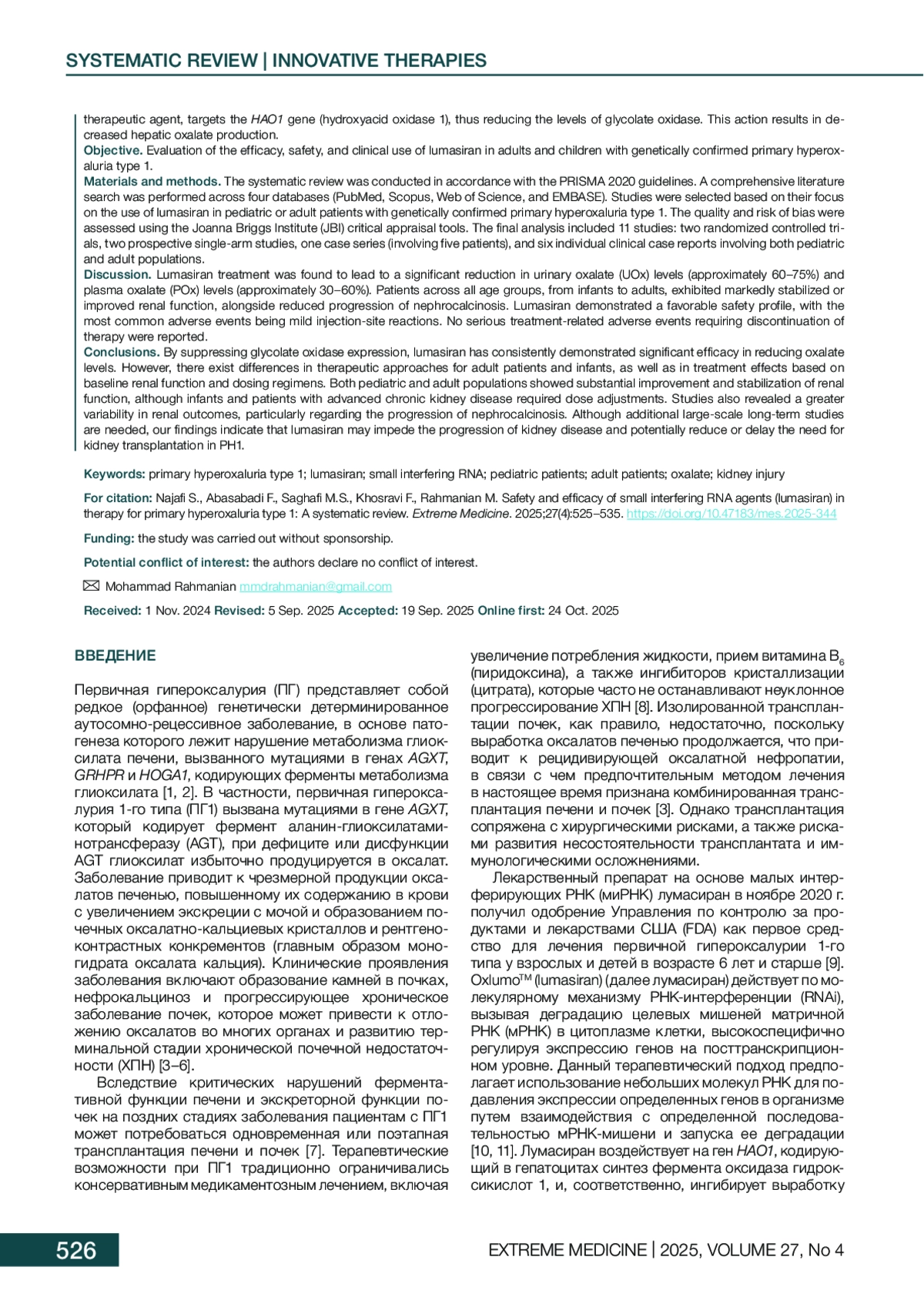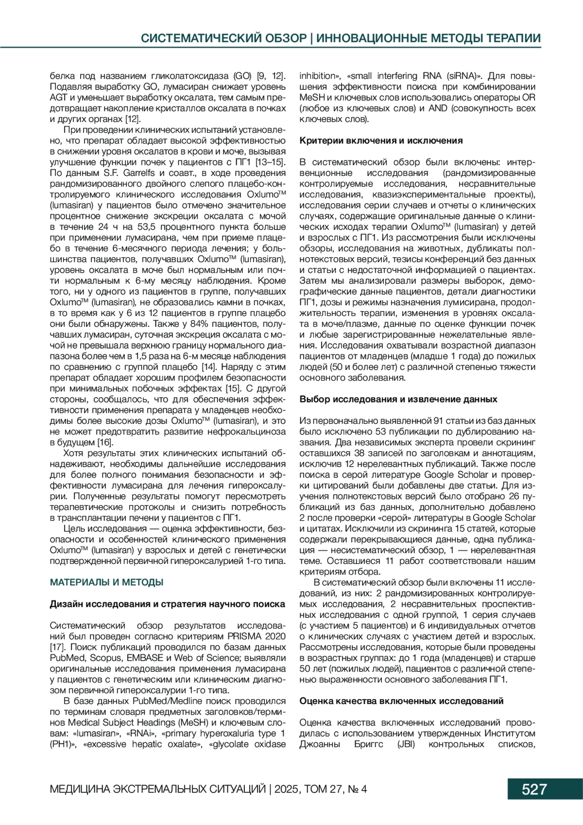 Материалы и методы. Систематический обзор проведен согласно критериям PRISMA 2020; выполнен поиск в четырех базах данных (PubMed, Scopus, Web of Science и EMBASE). Отобраны исследования о применении лумасирана у детей или взрослых пациентов с генетически подтвержденной первичной гипероксалурией 1-го типа. Качество и риск системной ошибки оценивали с помощью инструментов критического анализа JBI (Института Джоанны Бриггс). В работу включено 11 исследований (2 рандомизированных контролируемых исследования, 2 проспективных несравнительных исследования с одной группой, 1 серия случаев (с участием 5 пациентов) и 6 индивидуальных отчетов о клинических случаях с участием детей и взрослых).