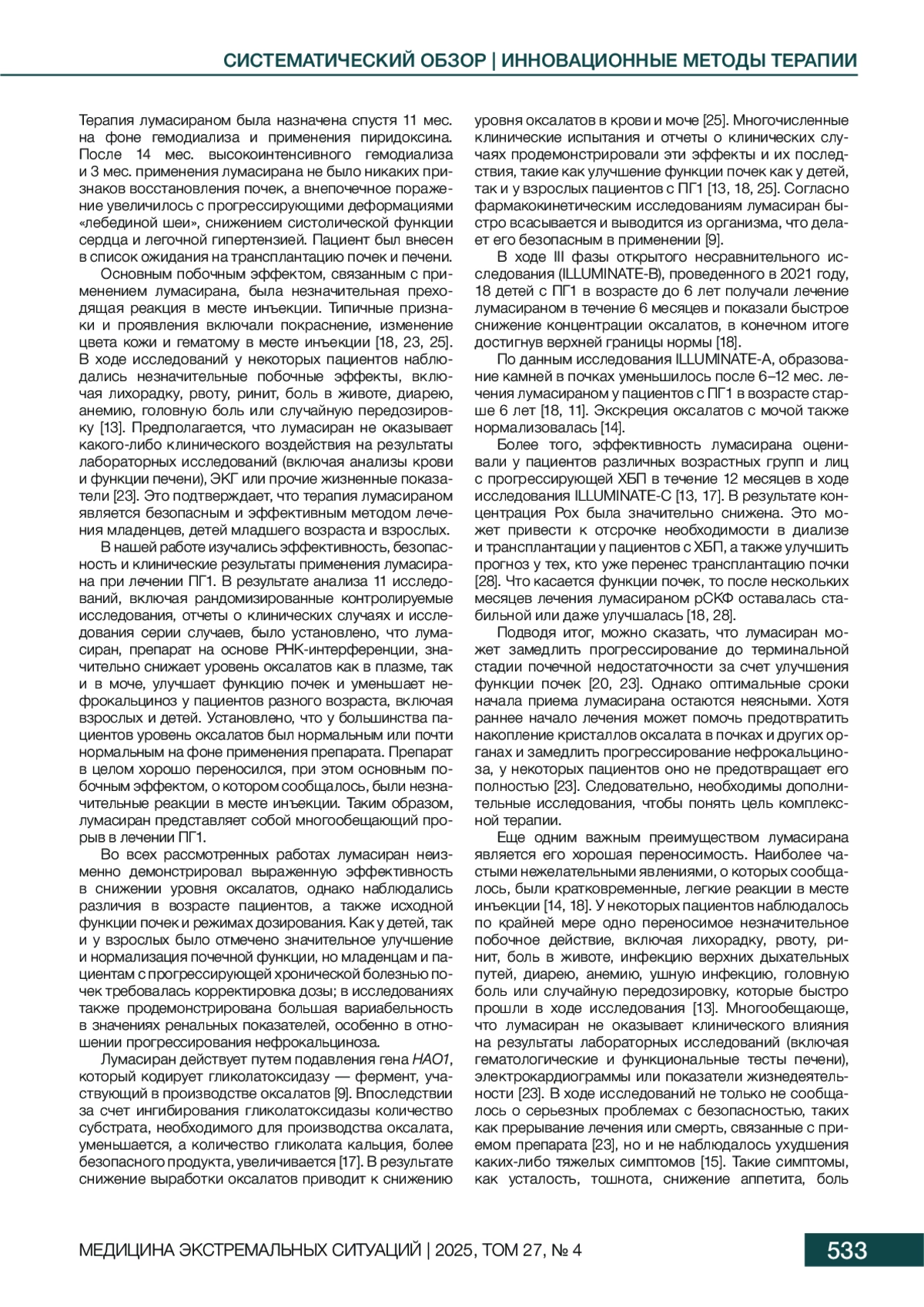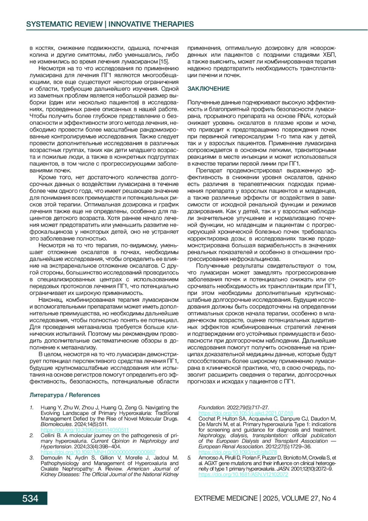 Выводы. Подавляя экспрессию гликолатоксидазы, лумасиран неизменно демонстрировал выраженную эффективность в снижении уровня оксалатов, однако есть различия в терапевтических подходах применения препарата у взрослых пациентов и младенцев, а также различные эффекты от воздействия в зависимости от исходной ренальной функции и режимов дозирования. Как у детей, так и у взрослых наблюдали значительное улучшение и нормализацию почечной функции, но младенцам и пациентам с прогрессирующей хронической болезнью почек требовалась корректировка дозы; в исследованиях также продемонстрирована большая вариабельность в значениях ренальных показателей и особенно в отношении прогрессирования нефрокальциноза. Хотя необходимы дополнительные крупномасштабные долгосрочные исследования, наши результаты показывают, что лумасиран может замедлять прогрессирование заболевания почек и потенциально снижать или отсрочить необходимость в трансплантации почек при ПГ1.