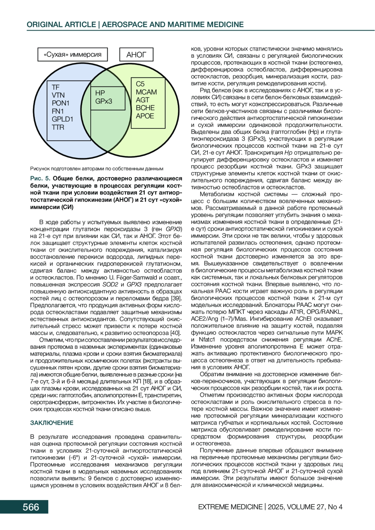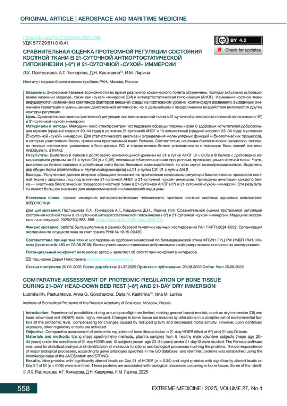 Выводы. Полученные данные впервые обращают внимание на протеомные механизмы регуляции биологических процессов костной ткани у здоровых лиц под влиянием 21-суточной АНОГ и 21-суточной «сухой» иммерсии. Приведены аннотации каждого белка — участника биологических процессов в костной ткани в 21-суточной АНОГ (-6°) и 21-суточной «сухой» иммерсии. Эти результаты имеют большое значение для авиакосмической и клинической медицины.