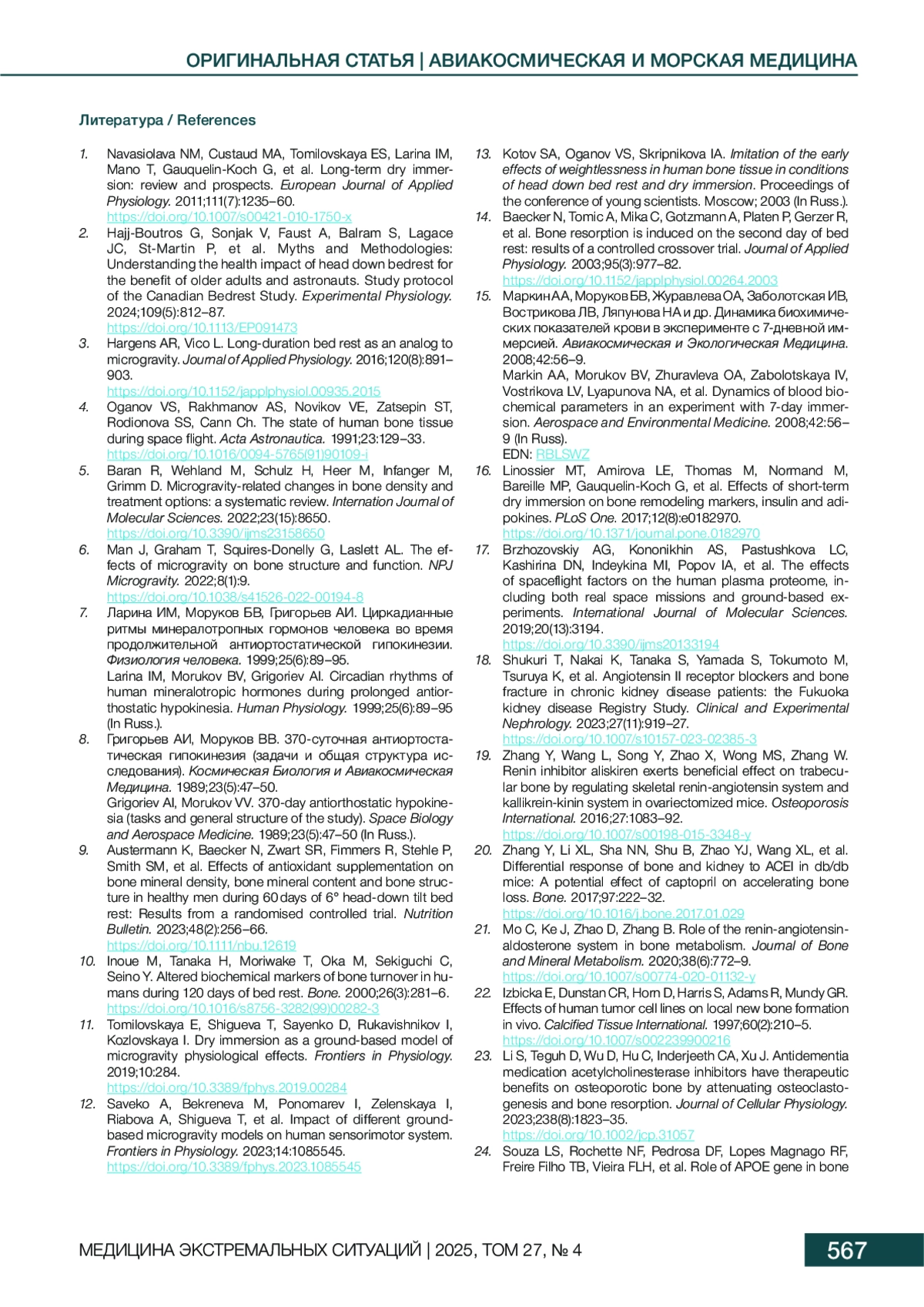7. Ларина ИМ, Моруков БВ, Григорьев АИ. Циркадианные ритмы минералотропных гормонов человека во время продолжительной антиортостатической гипокинезии. Физиология человека. 1999;25(6):89-95.