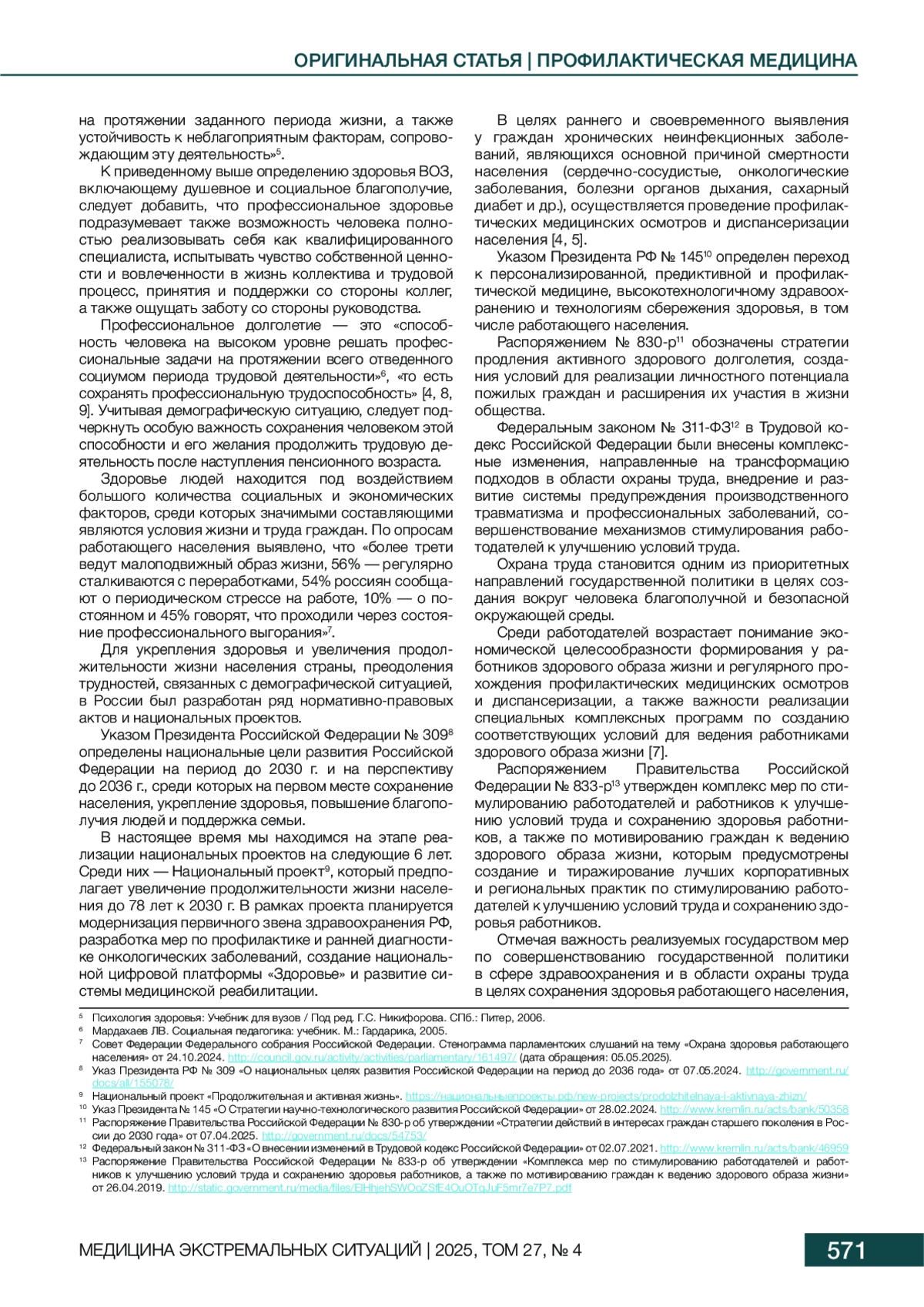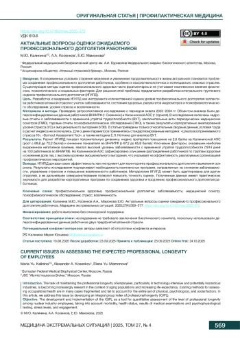 В современных демографических условиях старения общества и увеличения продолжительности жизни в России все более актуальной становится проблема сохранения профессионального долголетия работников для решения гуманитарных и народно-хозяйственных задач. Рост пенсионного возраста, повышение требований к квалификации и условиям труда требуют новых подходов к оценке и управлению профессиональной активностью работников на протяжении их карьеры. Вопрос продления профессионального долголетия неразрывно связан с обеспечением своевременной и доступной медицинской помощи, включая профилактику, диагностику и восстановление. Эти задачи являются приоритетом национального проекта «Продолжительная и активная жизнь», реализация которого началась с 01.01.2025.