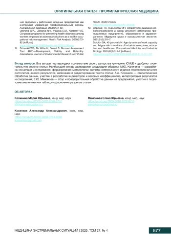 12. Сорокин ГА, Кирьянова МН. Возрастная динамика работоспособности и риска усталости работников промышленных предприятий, образования и здравоохранения. Медицина труда и промышленная экология. 2021;61(5):311-7.