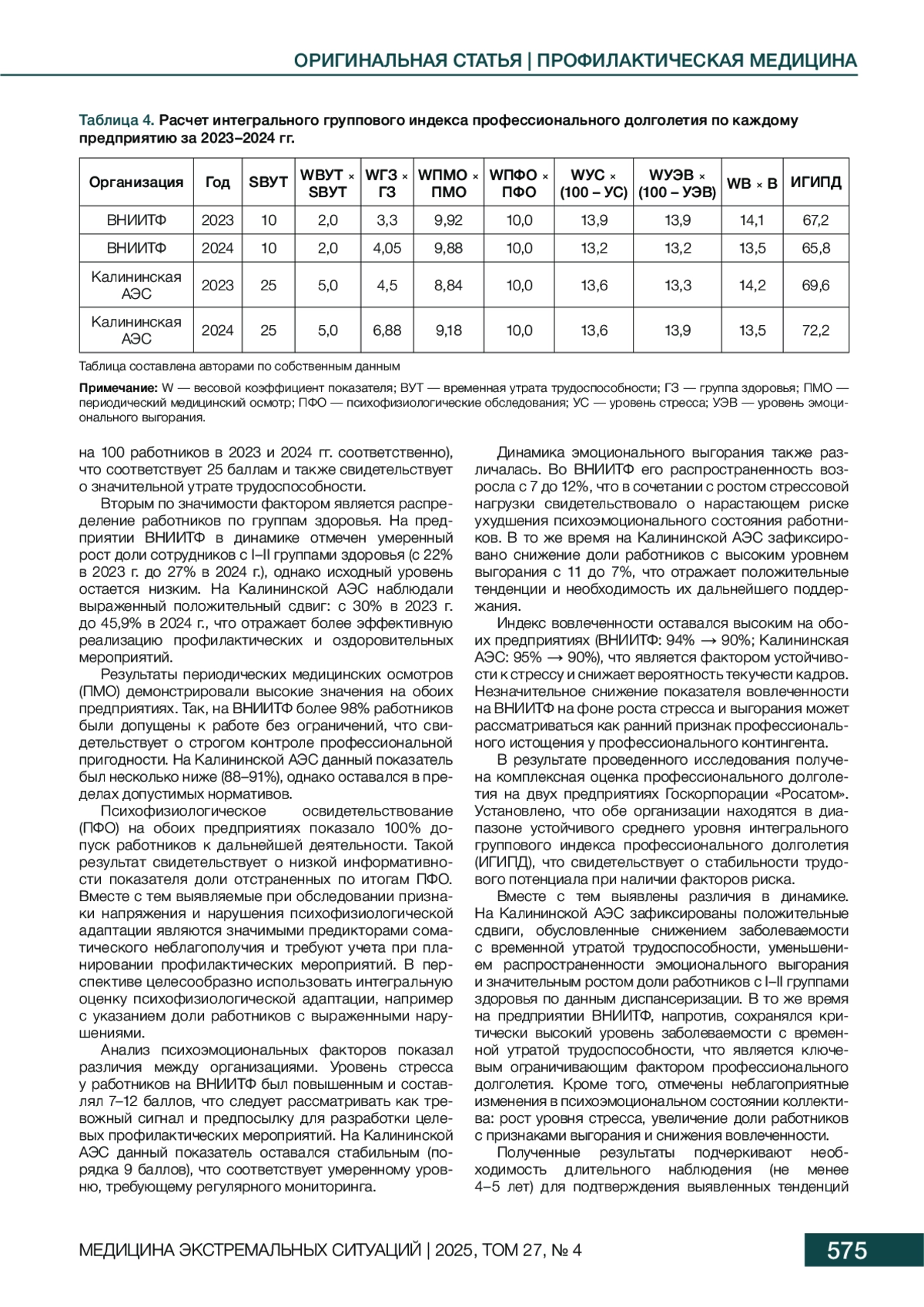 Материалы и методы. Проведено ретроспективное исследование с периодом охвата 2023–2024 гг. Объектом анализа были деперсонифицированные данные работников ВНИИТФ (г. Снежинск) и Калининской АЭС (г. Удомля). В исследование включены кадровые отчеты о заболеваемости с временной утратой трудоспособности (ВУТ), заключительные акты периодических медицинских осмотров (ПМО), годовые отчеты психофизиологических обследований (ПФО), а также результаты корпоративных анкетирований уровня стресса (УС) и эмоционального выгорания (УЭВ). В статье приведены только относительные сводные данные; условия труда в расчет индекса не включались. Для оценки параметров применялись стандартизированные методики: «Шкала воспринимаемого стресса-10», «Burnout Assessment Tool», а также методика Е. Л. Ноткина для анализа ВУТ.