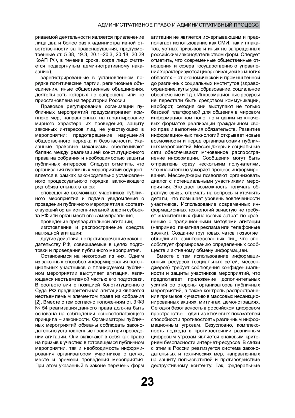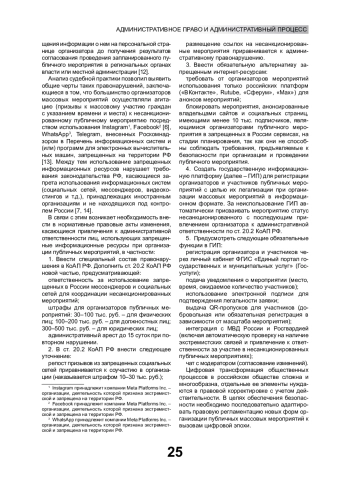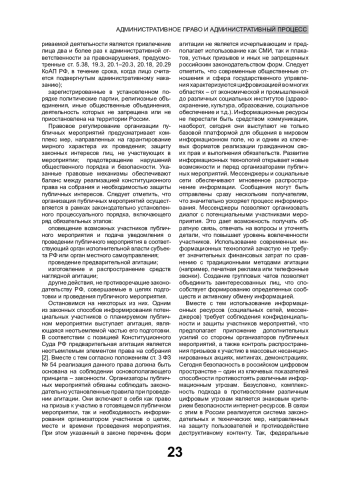 Исследуются правовые аспекты организации массовых мероприятий в условиях цифровизации общественных процессов. Особое внимание уделяется отдельным проблемам использования социальных сетей, мессенджеров, платформ для видеотрансляций. Рассматриваются нелегитимные направления цифровой организации публичных мероприятий: распространение противоправного цифрового контента; использование заблокированных в Российской Федерации цифровых ресурсов. Обозначаются возможные пути совершенствования законодательства в исследуемой сфере с учетом влияния цифровых трендов на общественные отношения в целом и обеспечение правопорядка в частности