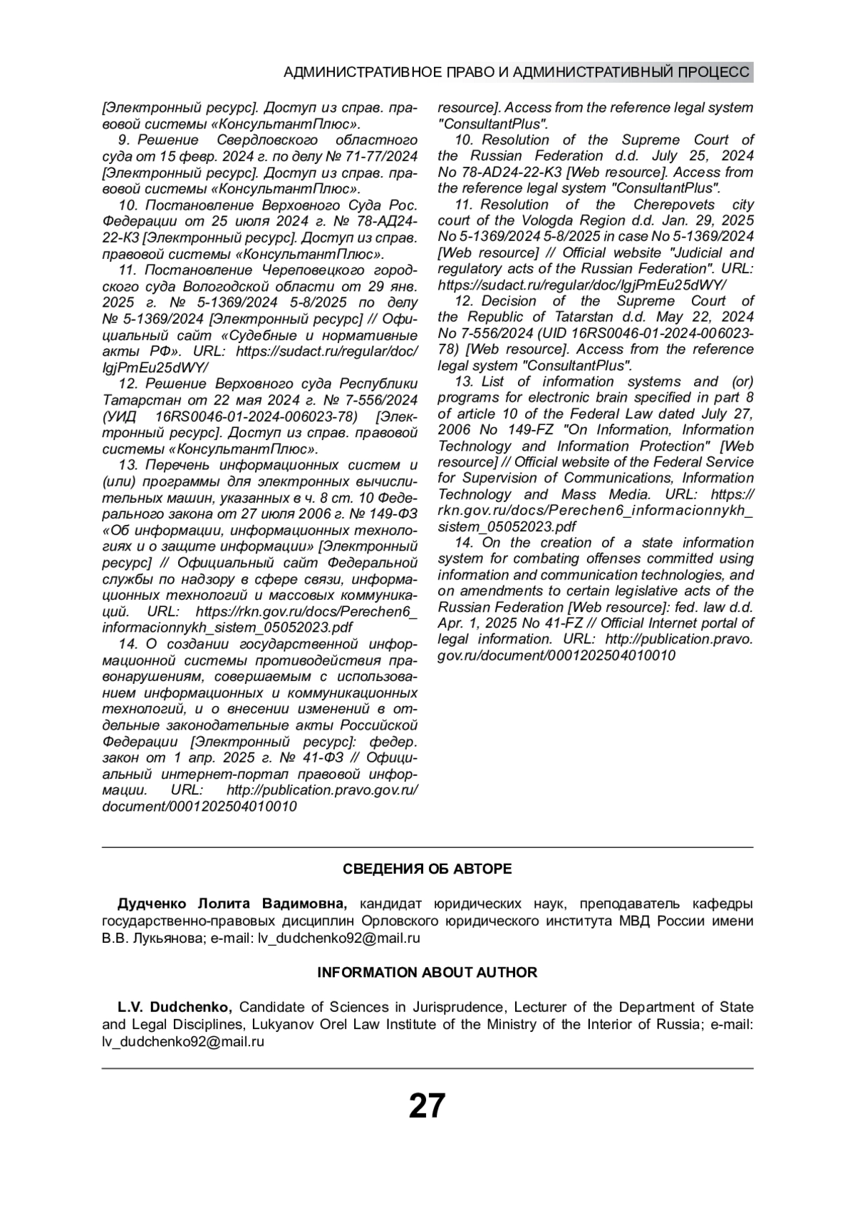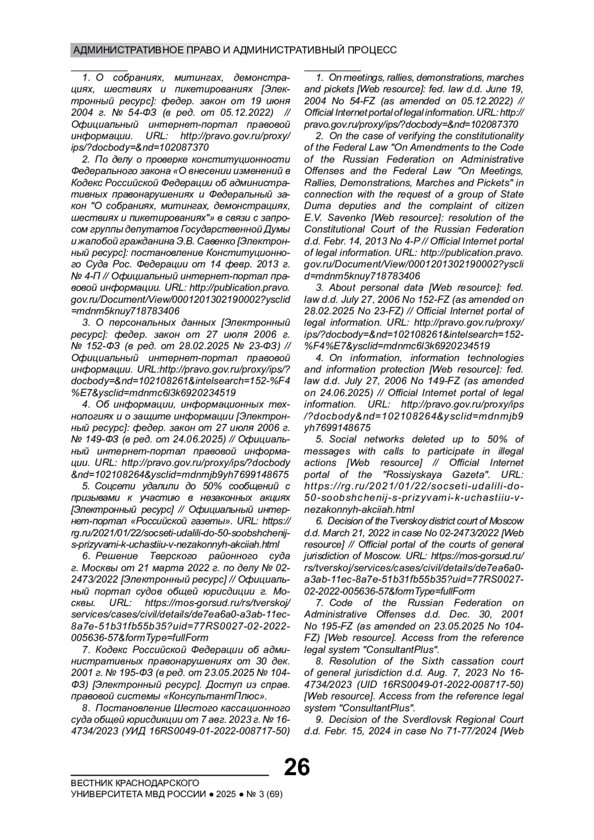 7. Кодекс Российской Федерации об административных правонарушениях от 30 дек. 2001 г. № 195-ФЗ (в ред. от 23.05.2025 № 104-ФЗ) [Электронный ресурс]. Доступ из справ. правовой системы “КонсультантПлюс”.