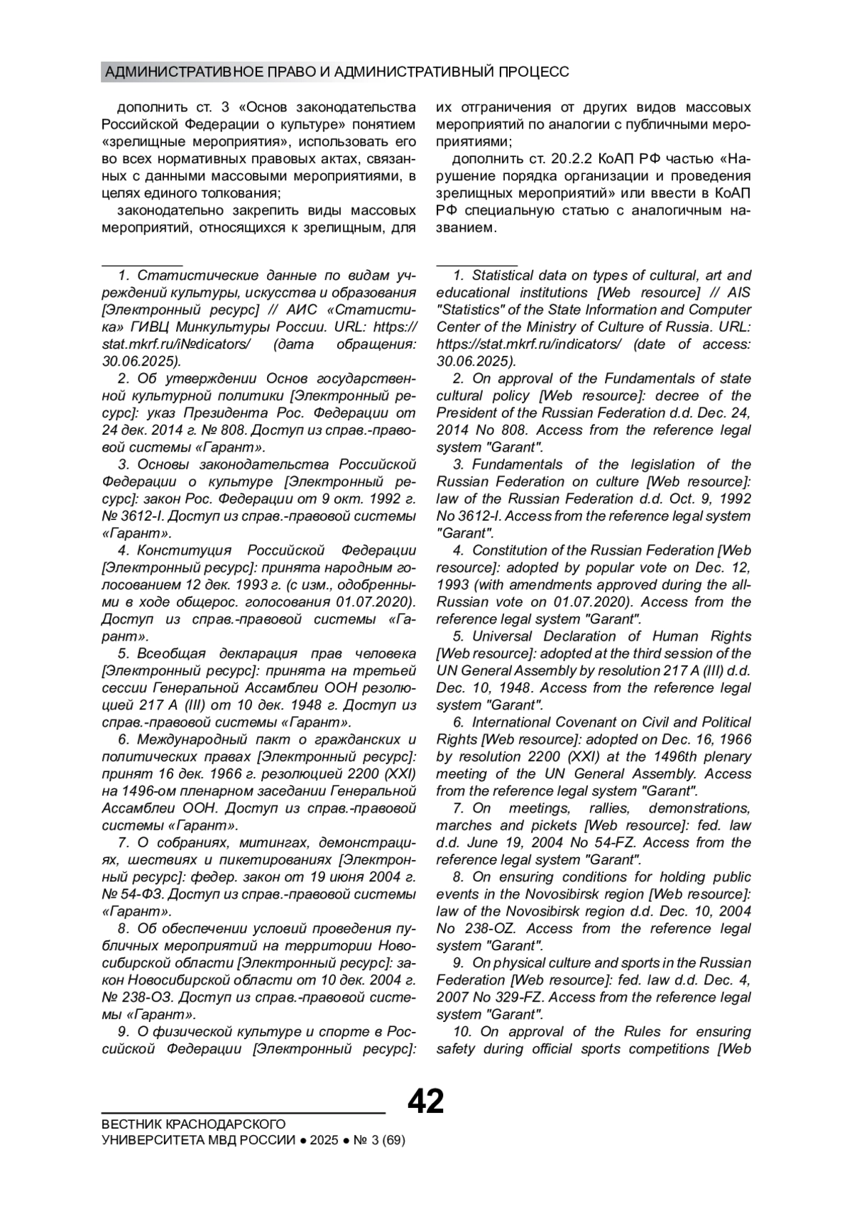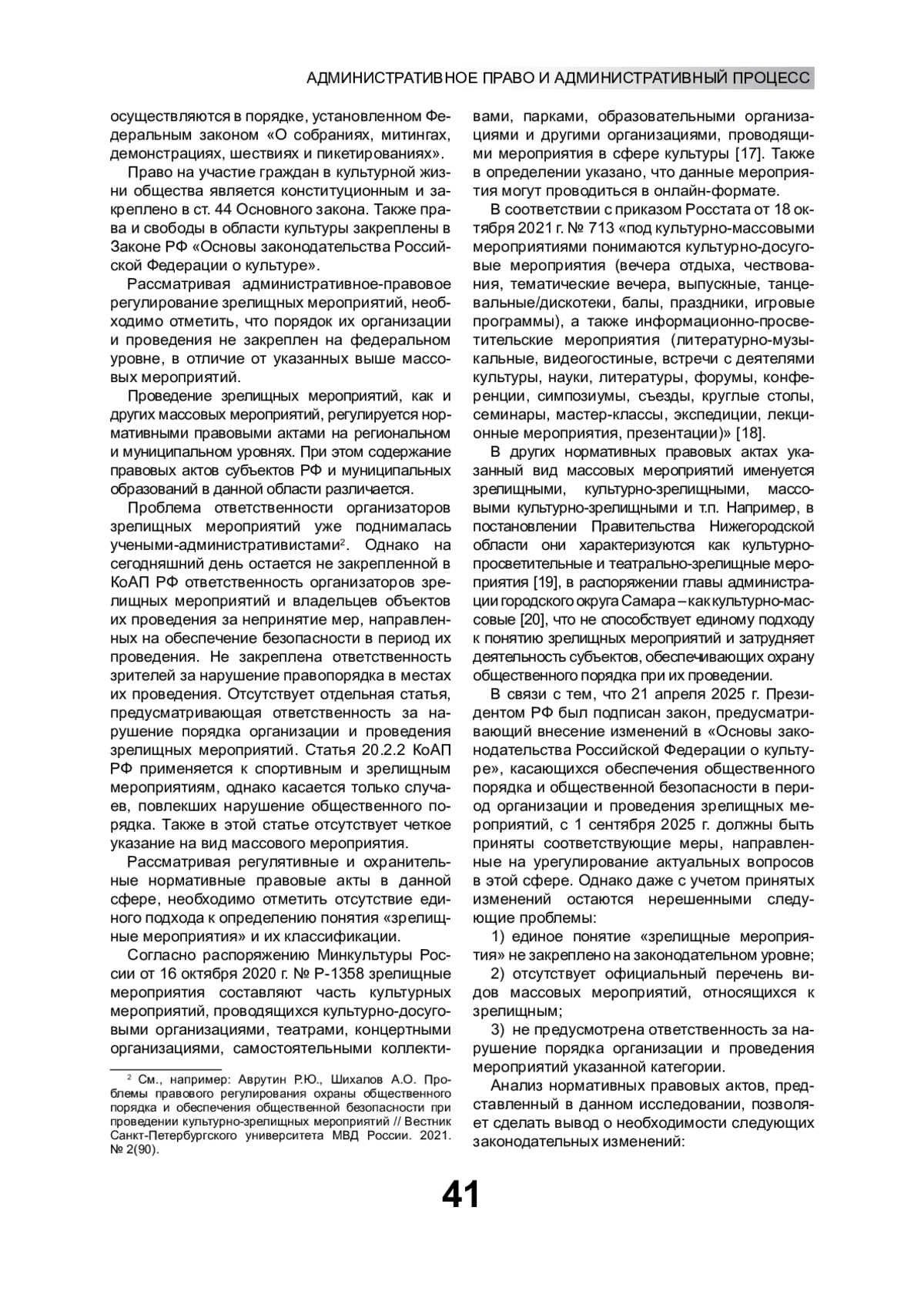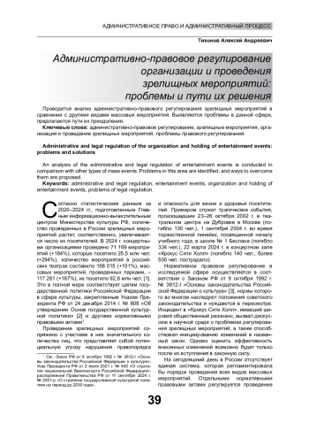 Согласно статистическим данным за 2020–2024 гг., подготовленным Главным информационно-вычислительным центром Министерства культуры РФ, количество проведенных в России зрелищных мероприятий растет, соответственно, увеличивается число их посетителей. В 2024 г. концертными организациями проведено 71 169 мероприятий (+164%), которые посетило 25,5 млн чел. (+294%), количество мероприятий в российских театрах составило 168 015 (+101%), массовых мероприятий, проведенных парками, – 117 281 (+167%), их посетило 92,6 млн чел. [1]. Это в полной мере соответствует целям государственной политики Российской Федерации в сфере культуры, закрепленным Указом Президента РФ от 24 декабря 2014 г. No 808 «Об утверждении Основ государственной культурной политики» [2] и другими нормативными правовыми актами