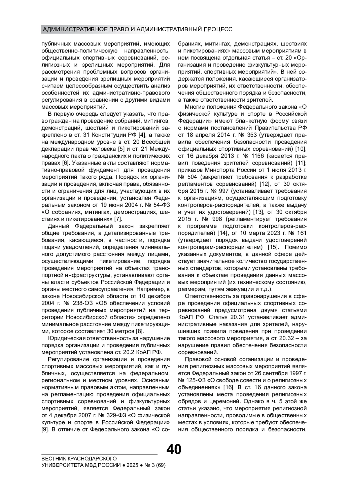 Анализируются вопросы правового регулирования деятельности по обеспечению охраны общественного порядка и общественной безопасности при проведении массовых мероприятий. Рассматриваются проблемы законодательного регулирования организации и проведения массовых мероприятий, определяются перспективные направления их разрешения. Подчеркивается приоритетное значение эффективного взаимодействия правоохранительных органов и организаторов массовых мероприятий в процессе обеспечения охраны общественного порядка и общественной безопасности