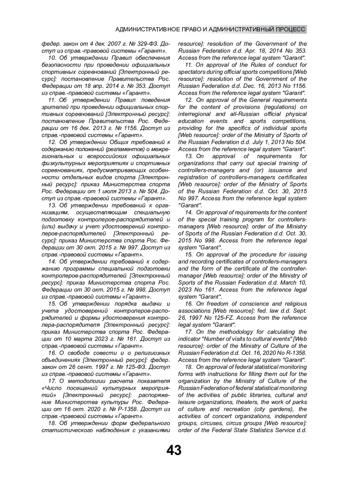 15. Об утверждении порядка выдачи и учета удостоверений контролеров-распорядителей и формы удостоверения контролера-распорядителя [Электронный ресурс]: приказ Министерства спорта Рос. Федерации от 10 марта 2023 г. № 161. Доступ из справ.-правовой системы “Гарант”.