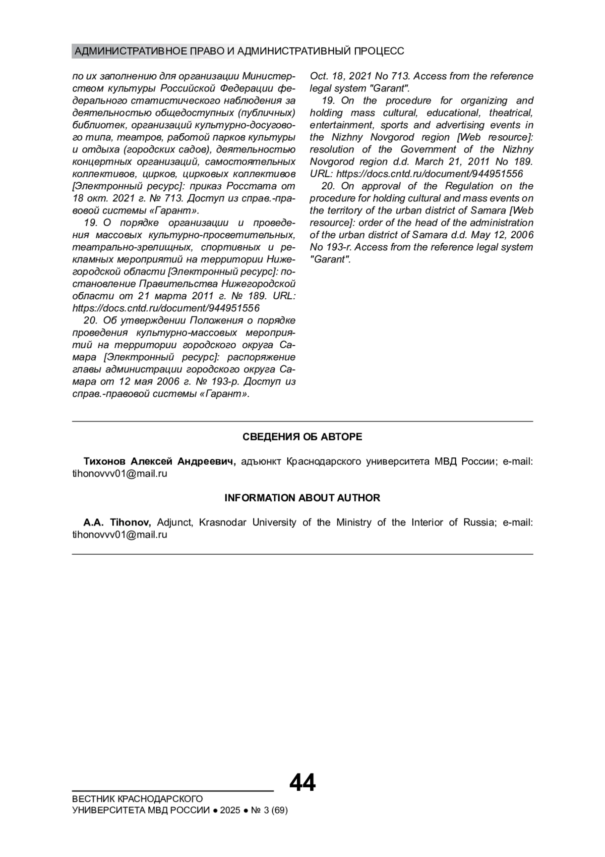 20. Об утверждении Положения о порядке проведения культурно-массовых мероприятий на территории городского округа Самара [Электронный ресурс]: распоряжение главы администрации городского округа Самара от 12 мая 2006 г. № 193-р. Доступ из справ.-правовой системы “Гарант”.