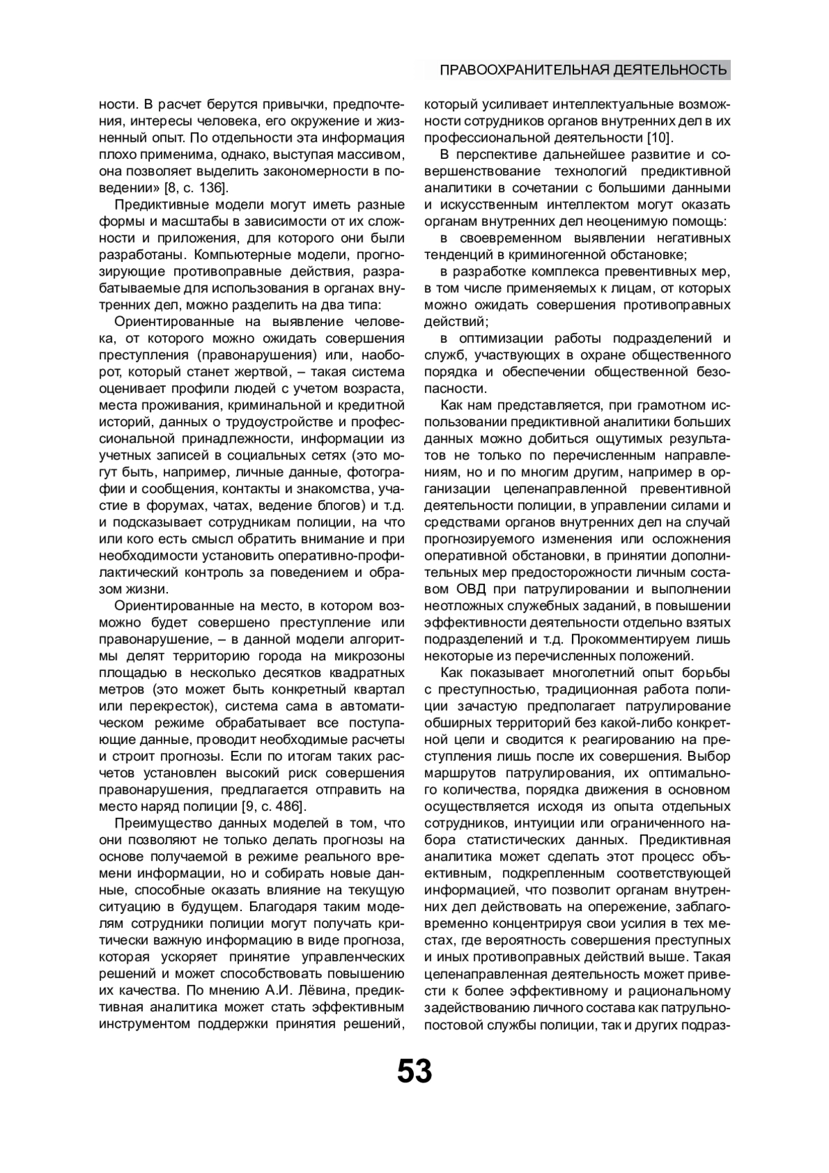 10. Лёвин А.И. К вопросу применимости предиктивной аналитики в правоохранительной деятельности // Двойные технологии. 2024. № 4(109). С. 41-43. EDN: IZHKIW