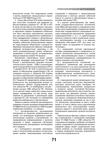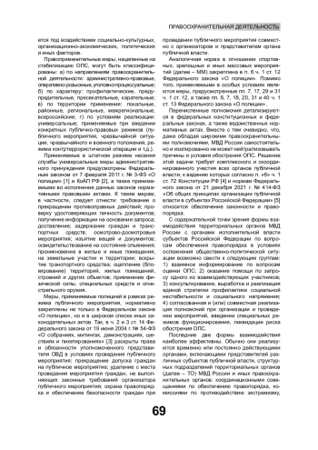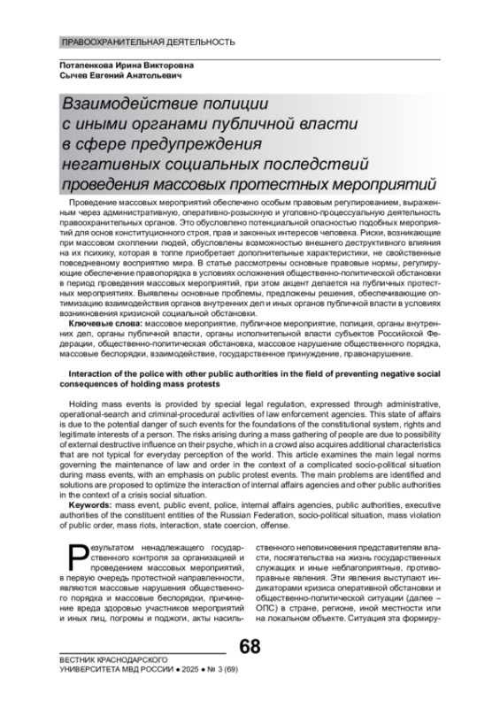 Проведение массовых мероприятий обеспечено особым правовым регулированием, выраженным через административную, оперативно-розыскную и уголовно-процессуальную деятельность правоохранительных органов. Это обусловлено потенциальной опасностью подобных мероприятий для основ конституционного строя, прав и законных интересов человека. Риски, возникающие при массовом скоплении людей, обусловлены возможностью внешнего деструктивного влияния на их психику, которая в толпе приобретает дополнительные характеристики, не свойственные повседневному восприятию мира. В статье рассмотрены основные правовые нормы, регулирующие обеспечение правопорядка в условиях осложнения общественно-политической обстановки в период проведения массовых мероприятий, при этом акцент делается на публичных протестных мероприятиях. Выявлены основные проблемы, предложены решения, обеспечивающие оптимизацию взаимодействия органов внутренних дел и иных органов публичной власти в условиях возникновения кризисной социальной обстановки
