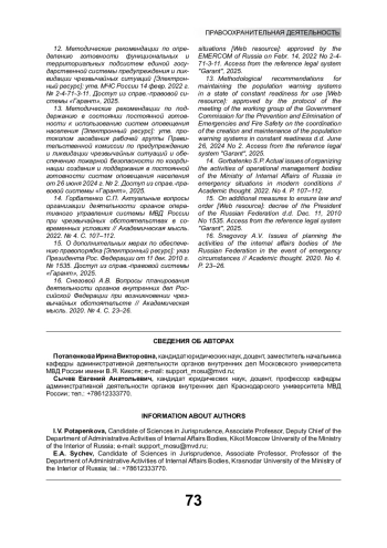 14. Горбатенко С.П. Актуальные вопросы организации деятельности органов оперативного управления системы МВД России при чрезвычайных обстоятельствах в современных условиях // Академическая мысль. 2022. № 4. С. 107-112. EDN: ALDZST