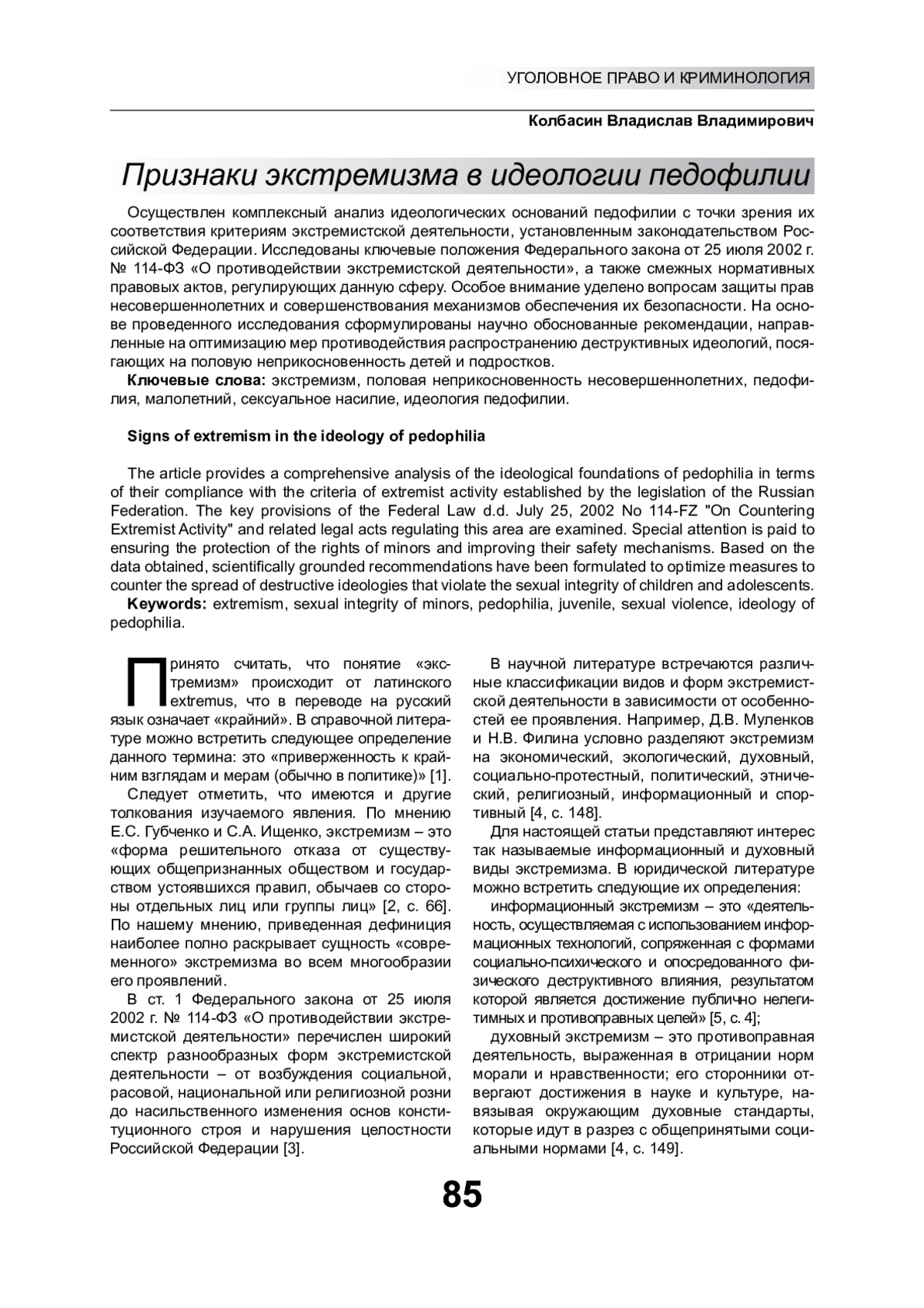 Осуществлен комплексный анализ идеологических оснований педофилии с точки зрения их соответствия критериям экстремистской деятельности, установленным законодательством Российской Федерации. Исследованы ключевые положения Федерального закона от 25 июля 2002 г. No 114-ФЗ «О противодействии экстремистской деятельности», а также смежных нормативных правовых актов, регулирующих данную сферу. Особое внимание уделено вопросам защиты прав несовершеннолетних и совершенствования механизмов обеспечения их безопасности. На основе проведенного исследования сформулированы научно обоснованные рекомендации, направленные на оптимизацию мер противодействия распространению деструктивных идеологий, посягающих на половую неприкосновенность детей и подростков