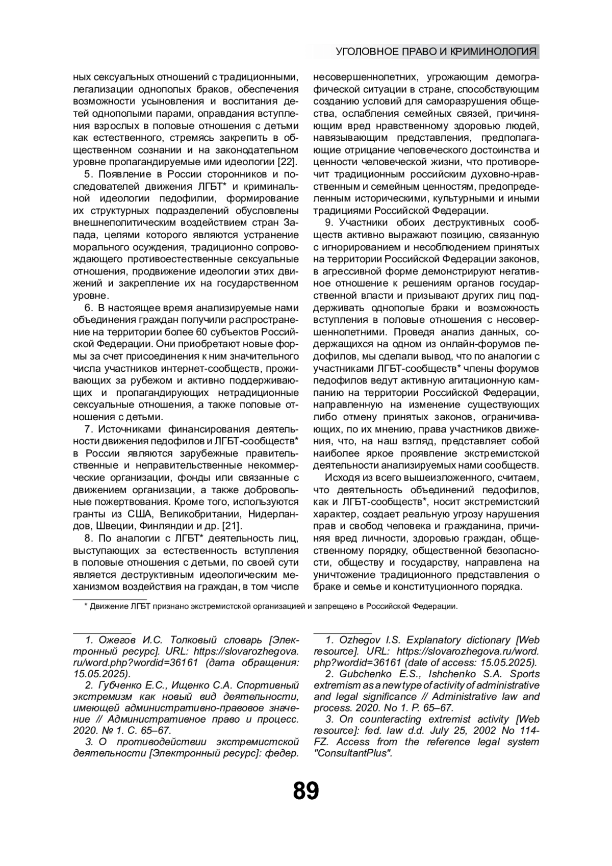 21. Эксперты “АГ” проанализировали решение Верховного Суда о признании экстремистским “движения ЛГБТ” [Электронный ресурс] // Информационный портал “Адвокатская газета”. URL: https://www.advgazeta.ru/novosti/eksperty-ag-proanalizirovali-reshenie-verkhovnogo-suda-o-priznanii-ekstremistskim-dvizheniya-lgbt/(дата обращения: 15.05.2025).