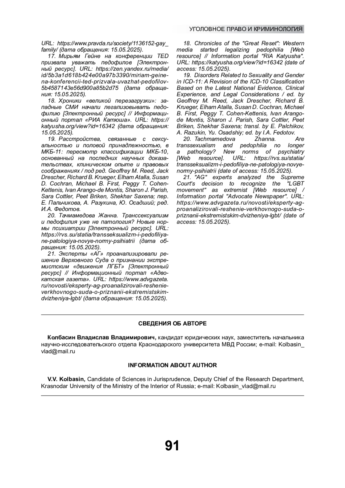 20. Тачмамедова Жанна. Транссексуализм и педофилия уже не патология? Новые нормы психиатрии [Электронный ресурс]. URL: https://rvs.su/statia/transseksualizm-i-pedofiliya-ne-patologiya-novye-normy-psihiatrii (дата обращения: 15.05.2025).