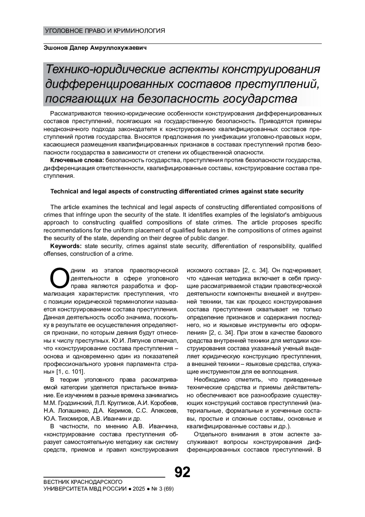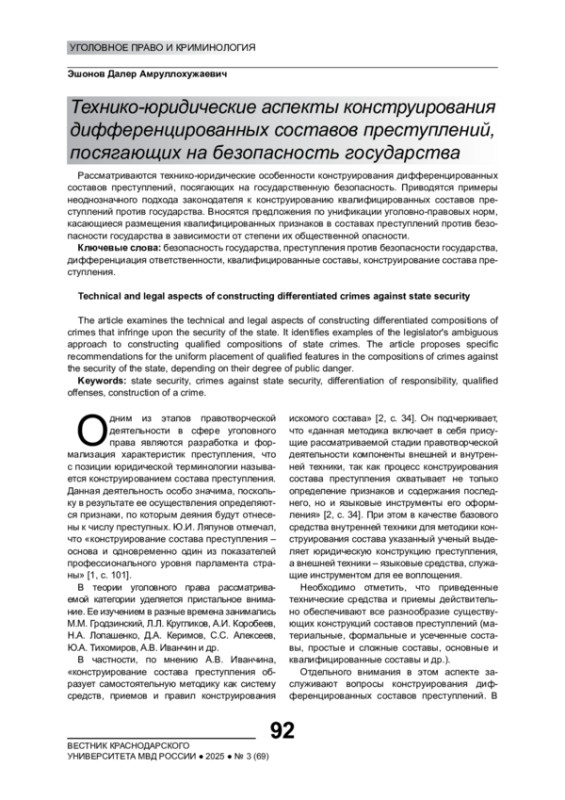 Рассматриваются технико-юридические особенности конструирования дифференцированных составов преступлений, посягающих на государственную безопасность. Приводятся примеры неоднозначного подхода законодателя к конструированию квалифицированных составов преступлений против государства. Вносятся предложения по унификации уголовно-правовых норм, касающиеся размещения квалифицированных признаков в составах преступлений против безопасности государства в зависимости от степени их общественной опасности