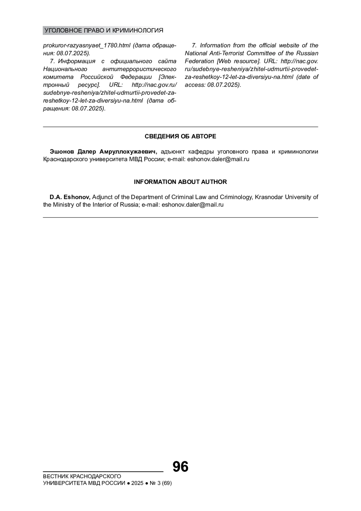 7. Информация с официального сайта Национального антитеррористического комитета Российской Федерации [Электронный ресурс]. URL: http://nac.gov.ru/sudebnye-resheniya/zhitel-udmurtii-provedet-za-reshetkoy-12-let-za-diversiyu-na.html (дата обращения: 08.07.2025).