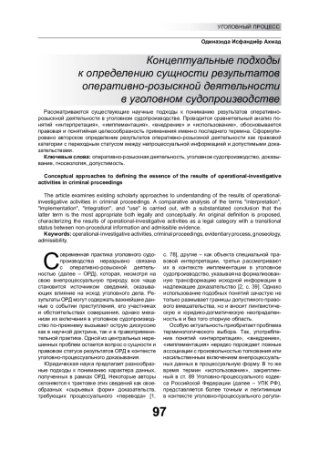 Рассматриваются существующие научные подходы к пониманию результатов оперативнорозыскной деятельности в уголовном судопроизводстве. Проводится сравнительный анализ понятий «интерпретация», «имплементация», «внедрение» и «использование», обосновывается правовая и понятийная целесообразность применения именно последнего термина. Сформулировано авторское определение результатов оперативно-розыскной деятельности как правовой категории с переходным статусом между непроцессуальной информацией и допустимыми доказательствами.